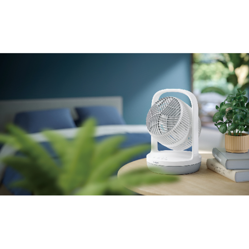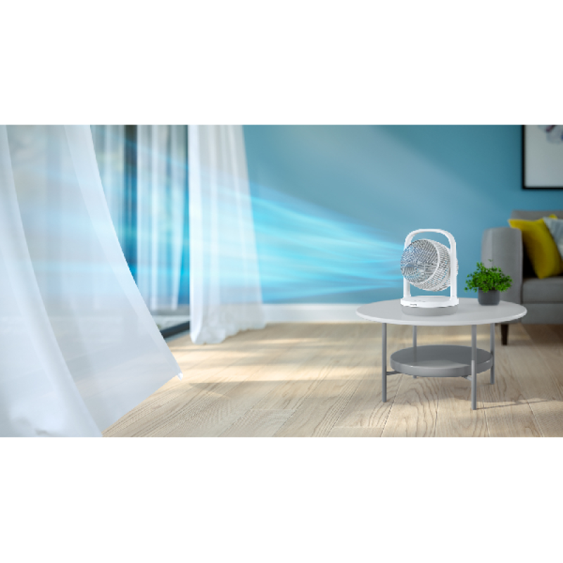 De witte Philips CX2050/00 ventilator geeft je de nodige verfrissing op warme dagen. Je zet het compacte toestel eenvoudig neer waar je maar wilt, zodat verkoeling altijd binnen handbereik is. Hij beschikt over 3 snelheidsstanden, die je simpelweg aanpast met een druk op de knop. Daarnaast kan je ook een timer instellen, zodat het toestel na een bepaalde periode automatisch uitschakelt. Zo val je bijvoorbeeld met een lekker briesje in slaap, maar hoef je ’s nachts niet weer uit bed om het apparaat uit te schakelen. Ook de hellingshoek kan je aanpassen, zodat de luchtstroom precies komt waar jij het wilt. Tot slot is de ventilator voorzien van een handvat en kan je hem dus gemakkelijk verplaatsen.