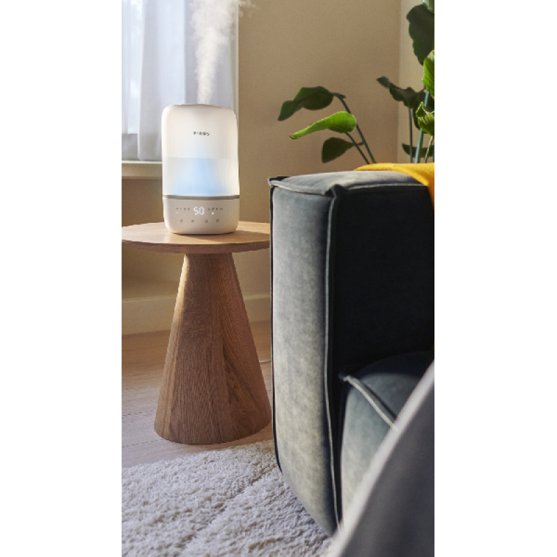 Adem altijd schone, gezonde lucht in wanneer je slaapt, woont of werkt met deze witte Philips HU1510 1000 Series luchtbevochtiger en geef een frisse, vochtige toets aan je woonruimte en slaapkamer. Met een hoogte van 35 cm en een diameter van 17 cm is dit kleine, ronde en compacte apparaat gemakkelijk op een nachtkastje of een tafel in de woonkamer te installeren. Hij is voorzien van een waterreservoir van 3 liter en is eenvoudig te bedienen met de Air+ app of de aanraakgevoelige knoppen aan de bovenkant. Hij biedt 4 luchtvochtigheidsniveaus van 40% tot 70% en met zijn 19,6 watt vermogen kan hij de lucht in een kamer van 41 m2 reinigen. Dankzij de meegeleverde aromatische filters, verspreidt hij een frisse, licht geparfumeerde lucht door je kamer voor jouw comfort. Met dit apparaat houd je schone lucht en een comfortabele luchtvochtigheid in je huis.