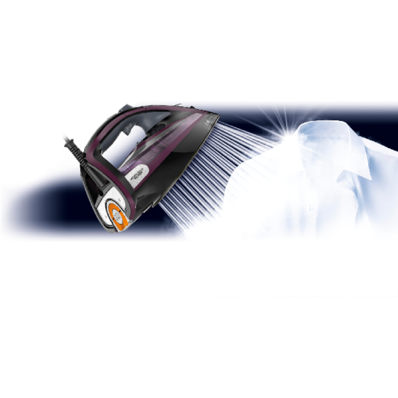 Om de temperatuur aan te passen aan het soort stof, biedt het apparaat 5 verwarmingsstanden. Met een vermogen van 3000 watt is het strijkijzer zeer efficiënt en warmt hij snel op. Het gemakkelijk aan de voorkant te vullen waterreservoir van 350 ml maakt het mogelijk om een grote hoeveelheid wasgoed in één keer te strijken. Het strijkijzer levert een continue stroom van 60 gram stoom per minuut voor gemakkelijk strijken. De persfunctie levert dan weer een stoomstoot van 240 g/min, om hardnekkige kreuken te verwijderen en dikke stoffen glad te strijken.
