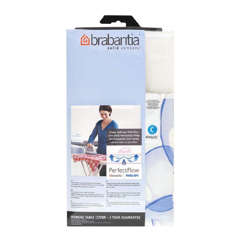 Uniek, meerlaags PerfectFlow strijkplankovertrek ontwikkeld door Philips en Brabantia voor sneller strijken zonder water op uw vloer.