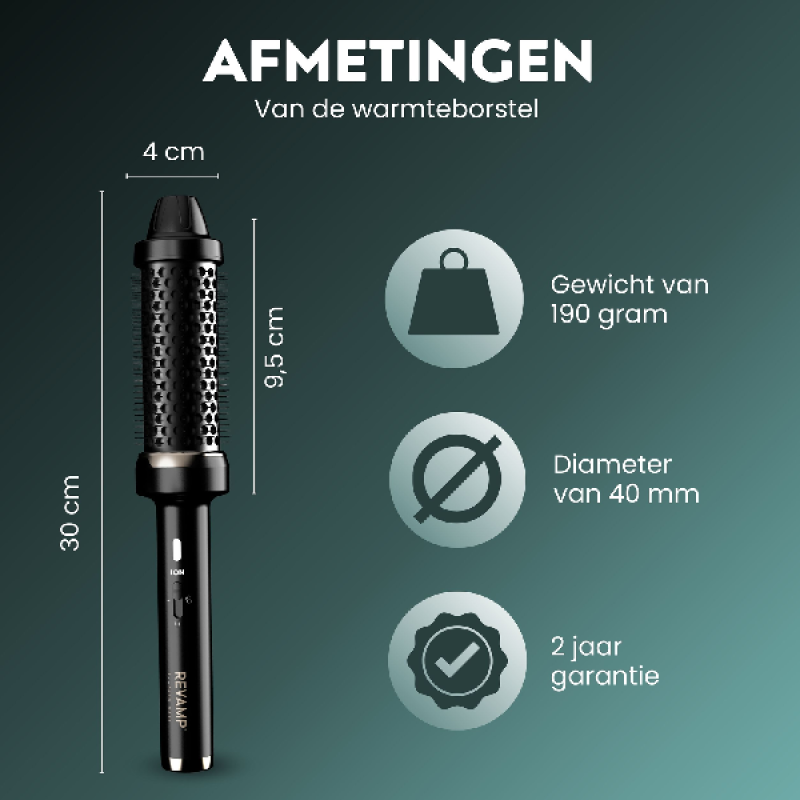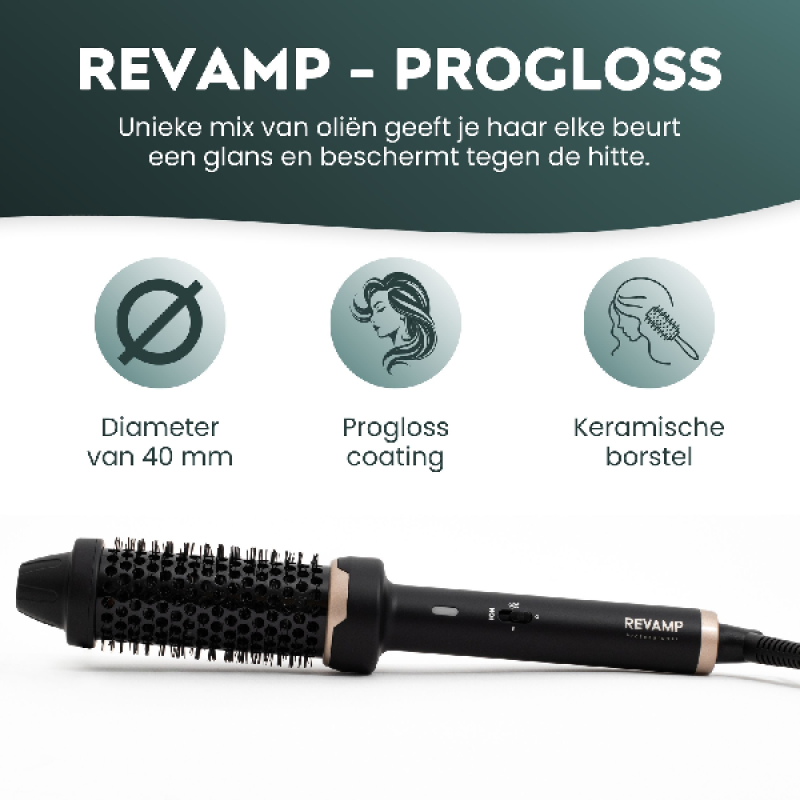 De zwarte Progloss Big Round Brush BR1400A blaasborstel van Revamp droogt en stijlt je haar in een handomdraai. Deze ronde borstel verwarmt van 0 tot 180° met 800 watt vermogen om je manen zachtjes te drogen. Om je haar gezond te houden heeft de borstel een keramische body die de warmte gelijkmatiger verdeelt en verrijkt met keratine-, argan- en kokosolie. De borstel is ook voorzien van ionische technologie om pluizen en het risico op haarbreuk te verminderen. De borstel werkt op netstroom en met het lange netsnoer van 3 meter word je niet gehinderd in je bewegingen. Met zijn cilindrische vorm en vederlichte gewicht van 416 gram is hij comfortabel in gebruik en kun je volumineuze, salonwaardige stijlen creëren, terwijl je goed voor je haar zorgt.