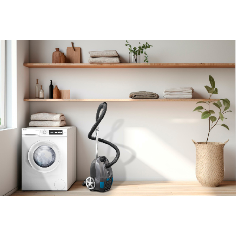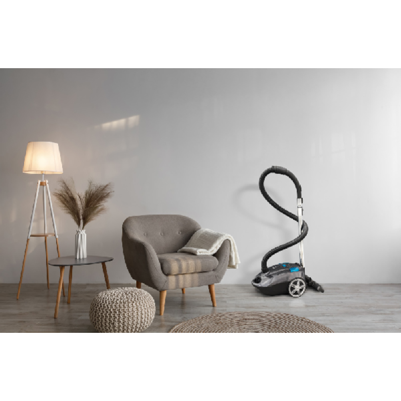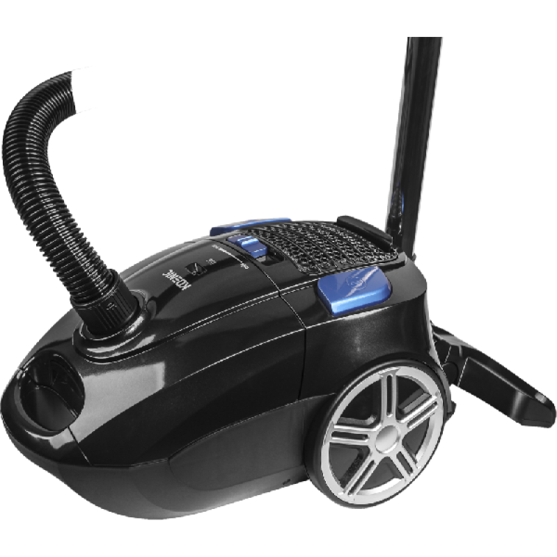 De zwarte Koenic KVC 7324 is een krachtige stofzuiger met zak met een actieradius van 8,3 meter rond het gebruikte stopcontact. Hij is niet alleen uiterst geschikt voor grote ruimtes maar je gebruikt hem ook voor zowel harde als zachte ondergronden. Het toestel maakt gebruik van stofzuigerzakken, wat niet alleen de zuigkracht ten goede komt maar ook zijn efficiëntie. Een stofzuigerzak van 3 liter gaat ongeveer 4 weken mee voor hij aan vervanging toe is. Tijdens het stofzuigen geniet je van ultiem gebruiksgemak. Via de grote aan-uitknop schakel je het toestel met je voet zowel in als uit. Ook de zuigkracht pas je eenvoudig aan via de schuifknop, zonder dat je hoeft te bukken.