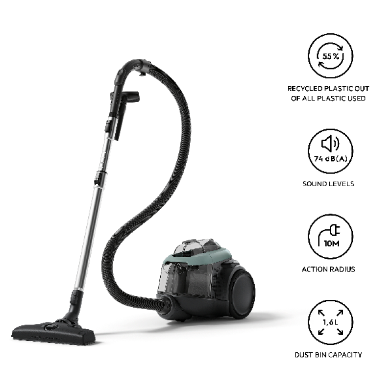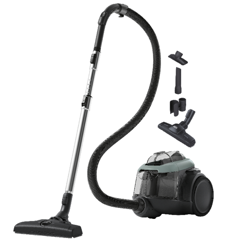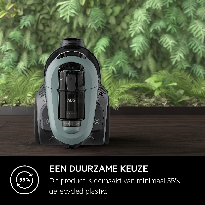 De zakloze stofzuiger CLEAN 6000 AL61C2ECO van AEG valt op door zijn compacte ontwerp en zwart en groene accenten afwerking. Met zijn afmetingen van 28 x 42 x 30 cm en lichtgewicht van 5.4 kilo is hij gemakkelijk te tillen en op te bergen, zowel verticaal als horizontaal. Deze stofzuiger is ontworpen voor dagelijks gebruik en biedt optimale wendbaarheid dankzij de XL-rubberen wielen, die zorgen voor een soepele beweging over alle oppervlakken. Hij is uitgerust met een snoer van 10 meter – met automatische oprolfunctie, dat een groot bereik biedt, zonder dat je het apparaat in elke kamer los hoeft te koppelen en weer aan te sluiten.