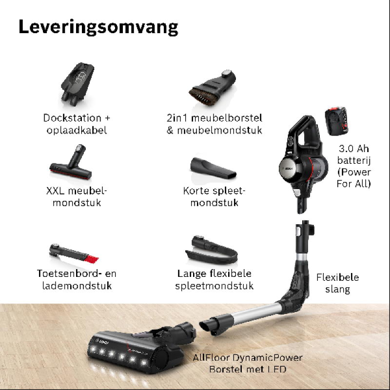 Om je te helpen bij het stofzuigen van verschillende oppervlakken en alle hoeken en gaten, wordt deze stofzuiger geleverd met een groot aantal praktische reinigingsborstels en hulpstukken, waaronder: 1 kierenzuigmond, 1 2-in-1 meubelborstel, 1 lange flexibele kierenzuigmond, 1 toetsenbord- en ladezuigmond, 1 meubelzuigmond met XXXL-clip en de gemotoriseerde borstel met ledlamp voor tapijten en harde vloeren die tot 99,9% van het stof opvangt. Alle mondstukken klik je eenvoudig vast op de kruimeldief of de flexibele telescopische buis. Er is ook een oplaadstation dat ook dienstdoet als opbergstation, zodat je het apparaat netjes in een hoek kan opbergen.