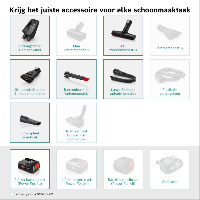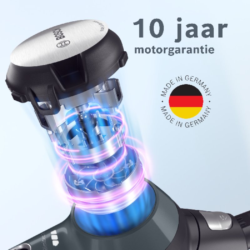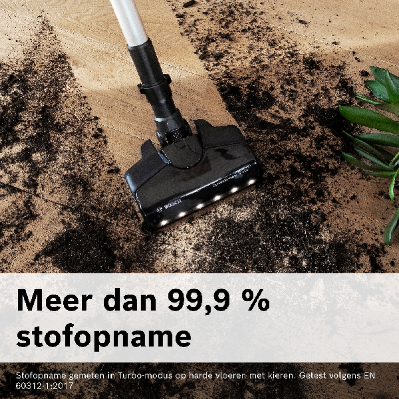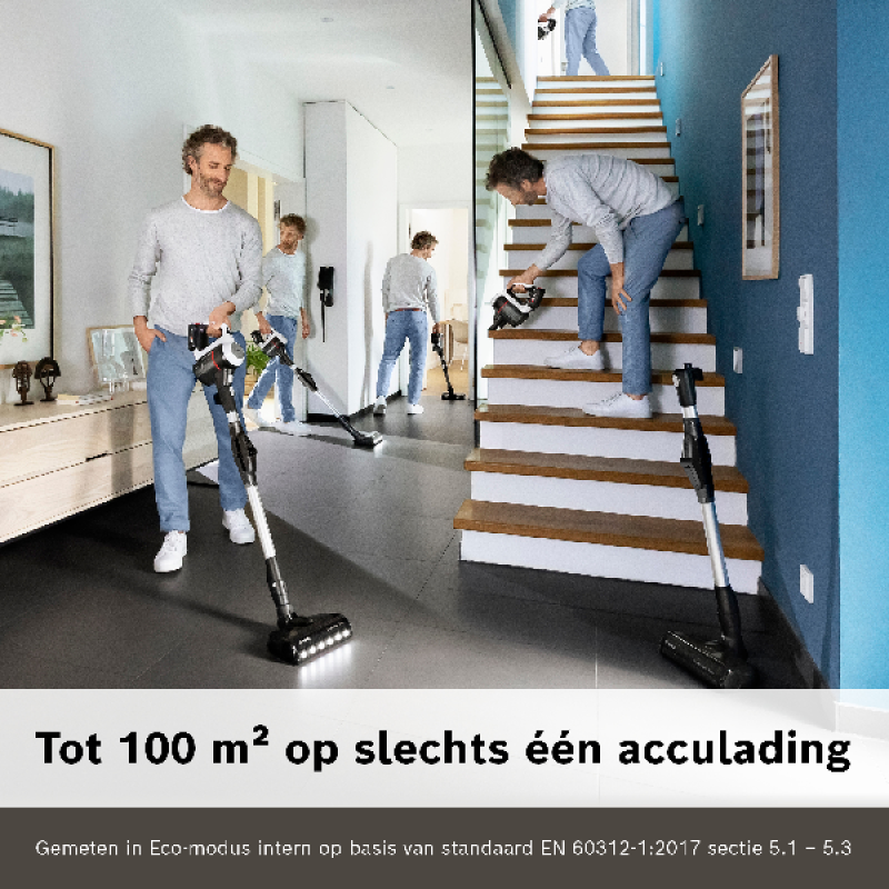 Bosch heeft deze stofzuiger uitgerust met een krachtige TurboSpin motor die tot 66.000 tpm draait en garant staat voor uitzonderlijke resultaten en grondig reinigen van alle oppervlakken. Daarbij werkt deze stofzuiger met de betrouwbare en duurzame 3Ah Power For All-accu van Bosch, die 40 minuten autonomie biedt en waarmee je een oppervlakte tot 100 m² kan stofzuigen in een keer. Deze lithium-ion-accu is in 5 uur volledig opgeladen en is compatibel met veel ander Bosch-gereedschap. Om de zuigkracht aan te passen aan het schoon te maken oppervlak, heeft de stofzuiger 3 vermogensniveaus die je eenvoudig kan aanpassen met de knop op de handgreep.