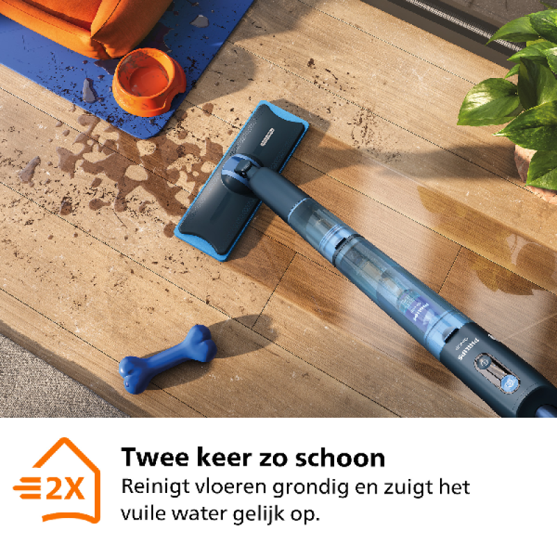De Philips OneUp XV5113/01 blauw is een krachtige elektrische mop. Dankzij de krachtige formule van het wasmiddel haal je zelfs onzichtbare allergenen weg, zodat bezoekers minder last hebben van stof of kattenharen. Ook zuigt de mop vuil water op, zodat de vloer sneller weer droog is. Dankzij de ingebouwde watertanks hoef je niet steeds het schoonmaken te onderbreken om je dweil weer in water te dompelen. Het schone water wordt bewaard in een tank van 281 ml, terwijl het vuile water apart wordt bewaard in een tank van 178 ml. Hiermee wordt schoonmaken een stuk gemakkelijker.