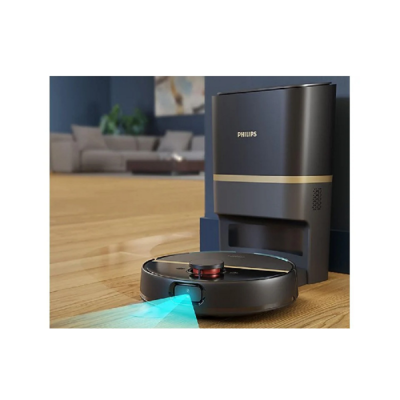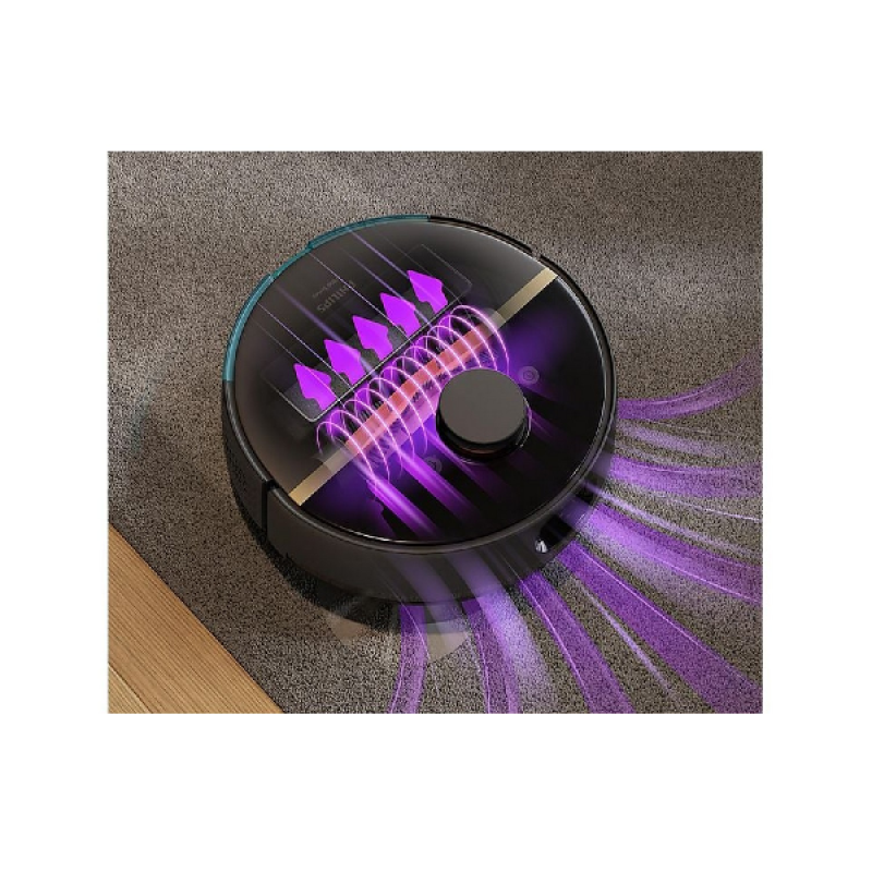 De HomeRun 7000 Series Aqua robotstofzuiger van Philips zal je schoonmaakroutine echt compleet veranderen. Hij is uitgerust met kunstmatige intelligentie waarmee hij je huis in kaart kan brengen en efficiënt kan navigeren. Hij detecteert obstakels, gaat om meubels heen en maakt zelfs langs randen schoon, zodat je van een grondige schoonmaakbeurt verzekerd bent. Deze robotstofzuiger zuigt niet alleen vuil op, maar kan ook vloeren wassen. Dankzij de ingebouwde watertank kan hij ook nat reinigen om vlekken en strepen te verwijderen. Je krijgt zo dus in één beweging vlekkeloze vloeren. Je plant reinigingstijden, kiest specifieke zones om schoon te maken en bedient zelfs je robotstofzuiger op afstand met de speciale mobiele app. Wanneer de batterij leeg is, keert hij automatisch terug naar zijn oplaadstation en gaat weer verder waar hij gebleven was zodra de batterij is opgeladen.