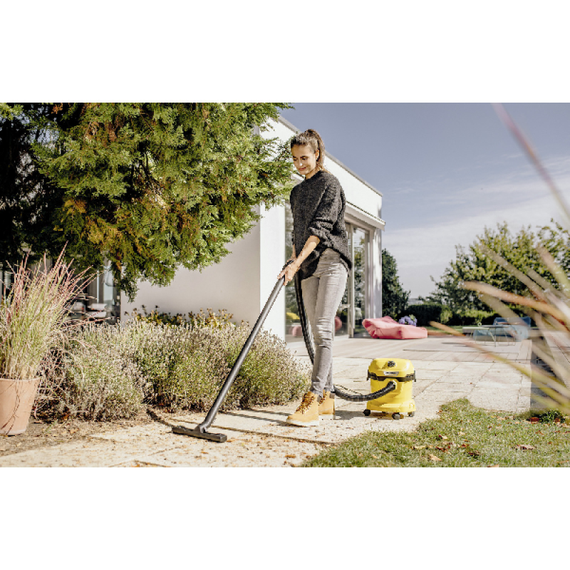 De Kärcher WD 2 Plus V-12/4/18 is een nat-/droogzuiger, waarmee je zowel droge stofdeeltjes als vocht kunt opzuigen. Het compacte design en de opvallende gele kleur maken hem direct herkenbaar en gemakkelijk te verplaatsen. Dankzij het ergonomische handvat draag je de stofzuiger eenvoudig van kamer naar kamer of naar de garage. Met afmetingen van 34,9 x 32,8 x 37,8 cm (D/B/H) en een gewicht van 6 kilo berg je hem snel op in een kast of onder een werkbank, waardoor hij weinig ruimte inneemt.