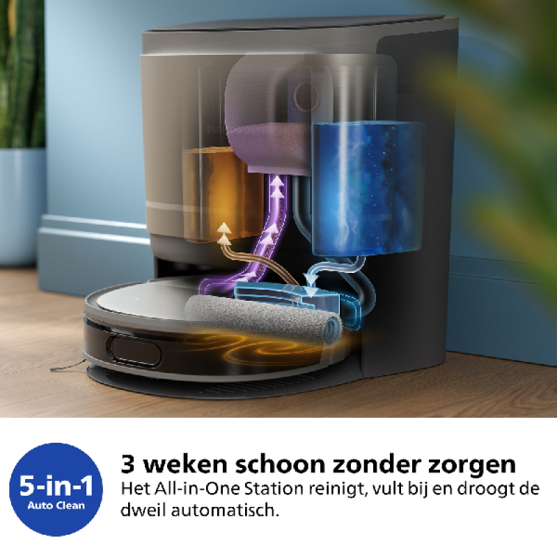De Homerun 9000 Serie reinigt niet alleen je vloeren en tapijten terwijl je weg bent, maar bespaart je ook een hoop onderhoud. Hij wordt namelijk geleverd met een All-in-One Station dat jouw leven een stuk makkelijker maakt. In dit station leegt de robotstofzuiger automatisch z’n stofbak, vult hij schoon water aan en loost hij zijn vuile dweilwater. Hierdoor heb je er alvast een paar weken geen omkijken naar. Daarnaast reinigt het station ook de dweil, die vervolgens op hoge temperatuur wordt gedroogd. Je robotstofzuiger is dus binnen no-time klaar voor de volgende ronde.