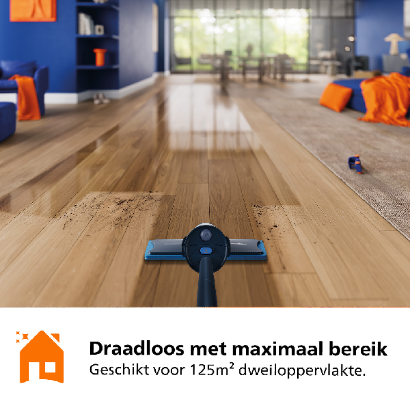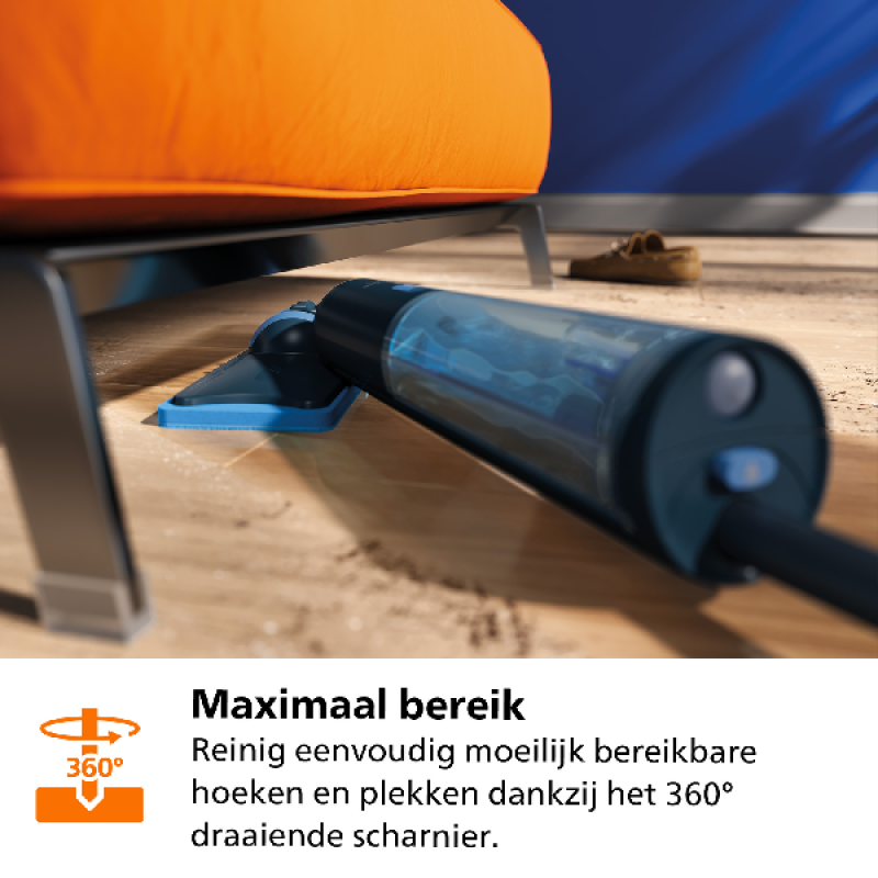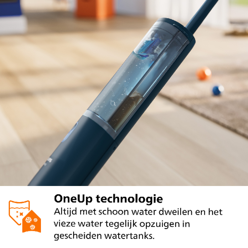 De Philips OneUp XV3101/11 blauw is een krachtige elektrische mop. Dankzij de krachtige formule van het wasmiddel haal je zelfs onzichtbare allergenen weg, zodat bezoekers minder last hebben van stof of kattenharen. Ook zuigt de mop vuil water op, zodat de vloer sneller weer droog is. Dankzij de ingebouwde watertanks hoef je niet steeds het schoonmaken te onderbreken om je dweil weer in water te dompelen. Het schone water wordt bewaard in een tank van 312 ml, terwijl het vuile water apart wordt bewaard in een tank van 270 ml. Hiermee wordt schoonmaken een stuk gemakkelijker.