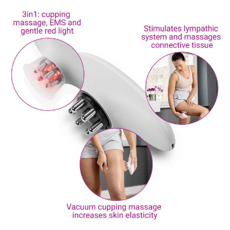 Dit witte VC150 massageapparaat van Medisana biedt je een ontspannende ervaring. Dit compacte toestel (6,9 x 6 x 15,3 cm) ligt goed in de hand en is perfect om je benen, armen, buik of rug te masseren. Dankzij de kleine cups creëert het een krachtig vacuüm op de huid, waardoor het de doorbloeding stimuleert, afvalstoffen helpt afvoeren en de elasticiteit van je huid verbetert. De VC150 is gebaseerd op principes uit de traditionele Chinese gezondheidsleer en maakt cupping therapie vanuit huis mogelijk. Deze moderne toepassing van cupping therapie combineert drie massagetherapieën in één apparaat: traditionele massage, EMS (elektronische spierstimulatie) en een zacht rood licht. Cupping massage is geschikt als sportmassage, maar biedt ook verlichting bij spanningen, spierpijn en zelfs migraine. De VC150 helpt ook bij het verminderen van cellulitis en het verbeteren van de algehele huidconditie, rechtstreeks vanuit je eigen huis.