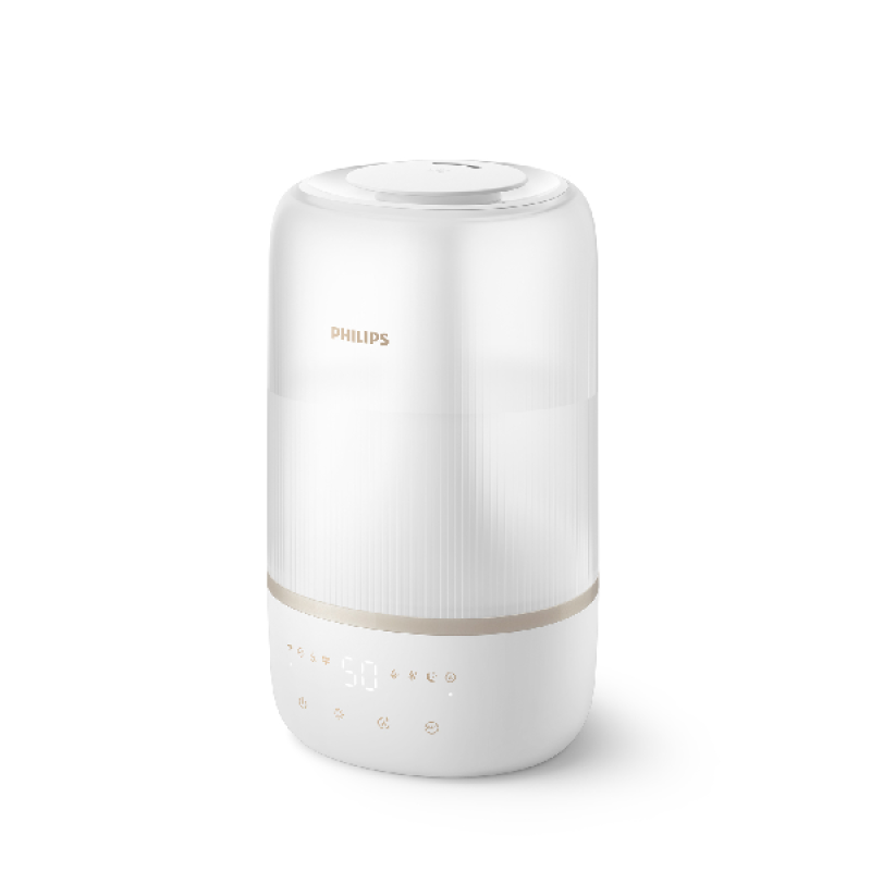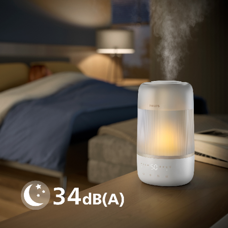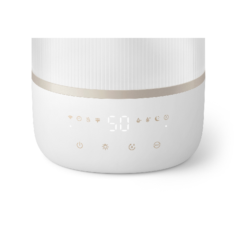 Adem altijd schone, gezonde lucht in wanneer je slaapt, woont of werkt met deze witte Philips HU1510 1000 Series luchtbevochtiger en geef een frisse, vochtige toets aan je woonruimte en slaapkamer. Met een hoogte van 35 cm en een diameter van 17 cm is dit kleine, ronde en compacte apparaat gemakkelijk op een nachtkastje of een tafel in de woonkamer te installeren. Hij is voorzien van een waterreservoir van 3 liter en is eenvoudig te bedienen met de Air+ app of de aanraakgevoelige knoppen aan de bovenkant. Hij biedt 4 luchtvochtigheidsniveaus van 40% tot 70% en met zijn 19,6 watt vermogen kan hij de lucht in een kamer van 41 m2 reinigen. Dankzij de meegeleverde aromatische filters, verspreidt hij een frisse, licht geparfumeerde lucht door je kamer voor jouw comfort. Met dit apparaat houd je schone lucht en een comfortabele luchtvochtigheid in je huis.