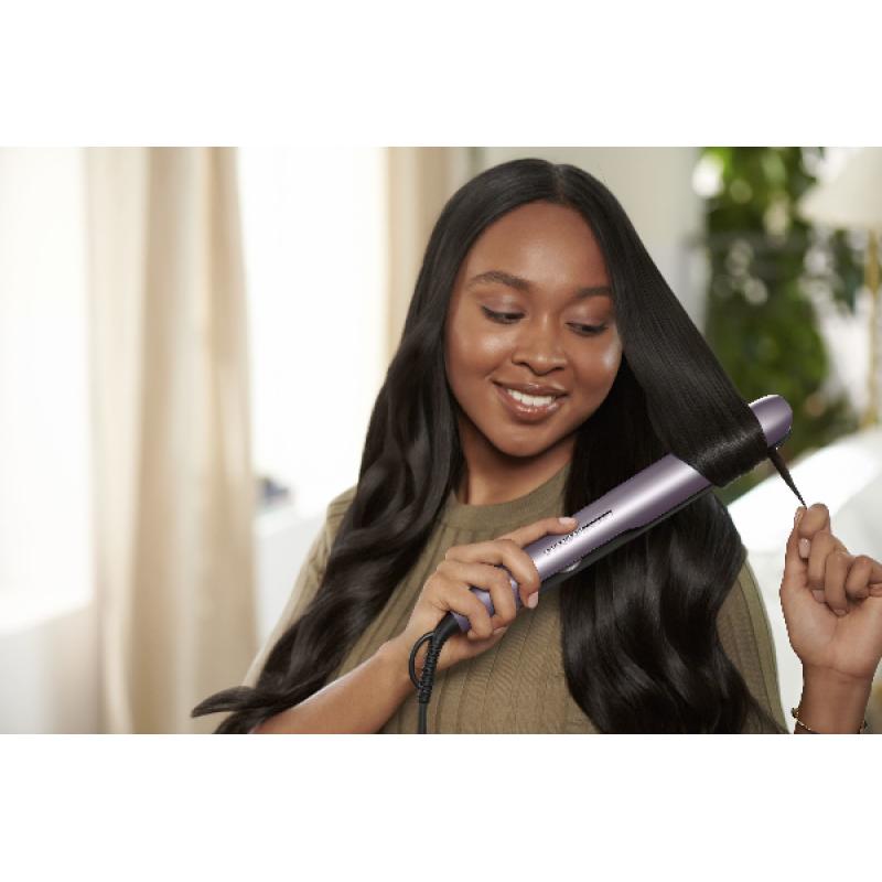 De straightener is uitgerust met keramische platen met arganolie voor snel en moeiteloos stylen met een soepele beweging die net zo zijdezacht aanvoelt als het haar eruitziet.