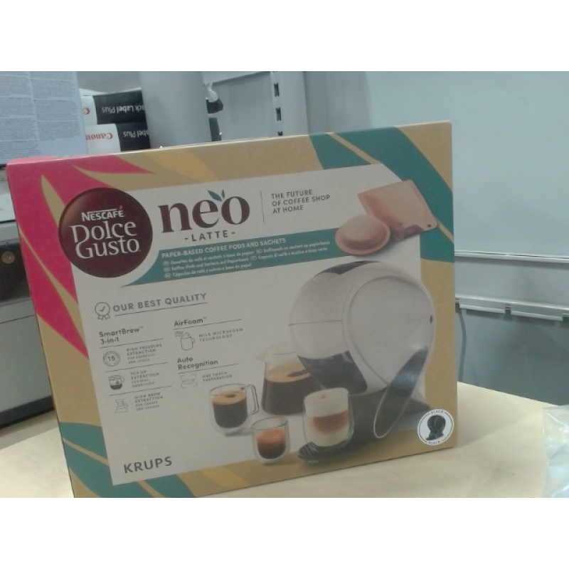 Geniet van barista-kwaliteit lattes, cappuccino’s en andere koffiespecialiteiten met de Dolce Gusto Neo Latte. Deze moderne machine in strak zwart herkent capsules automatisch en stemt temperatuur en hoeveelheid perfect af voor elke drank. Ideaal voor liefhebbers van melkdranken: met één druk op de knop zet je een romige, gelaagde latte zoals in je favoriete koffiebar. Slim design, volle smaak.