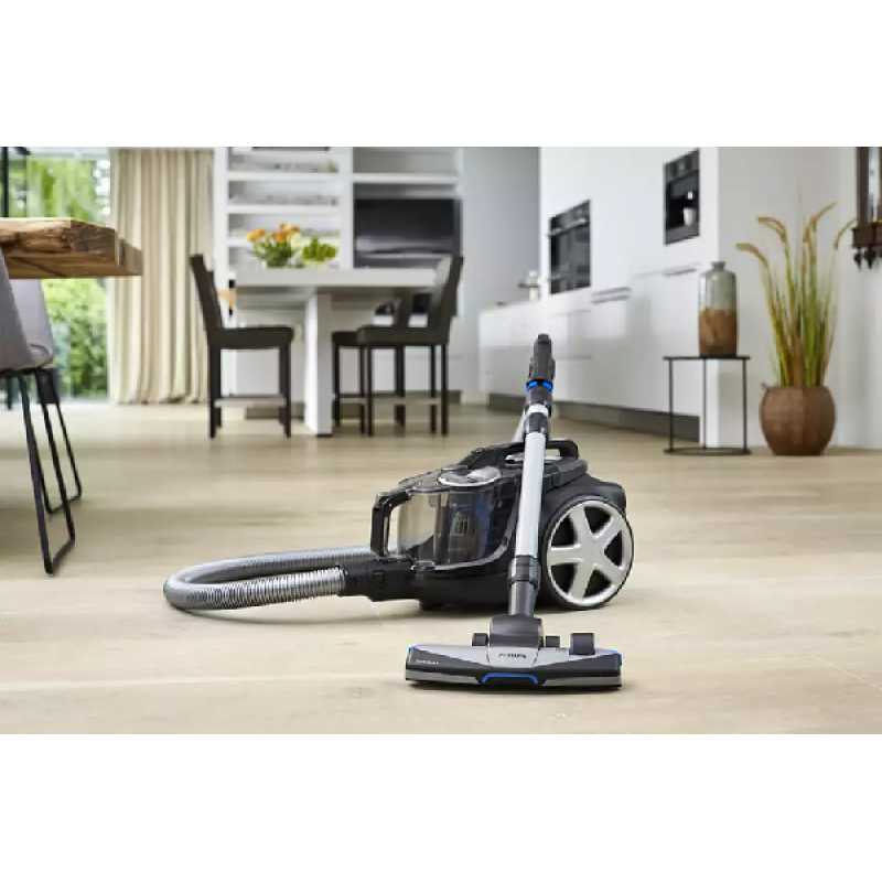 Deze compacte stofzuiger heeft 2 grote, flexibele wielen die stabiliteit en soepele beweging garanderen. Het aansluitsnoer van 7 meter biedt je een actieradius van 10 meter, zodat je een hele verdieping van je huis kan stofzuigen zonder de stekker uit het stopcontact te hoeven halen om van de ene naar de andere kamer te gaan. Hij heeft een uitneembare stofbak van 2 liter die je gemakkelijk met één hand kan legen. De stofzuiger is heel eenvoudig te bedienen dankzij een digitale krachtvariator op de handgreep, waarmee je de zuigkracht kan aanpassen aan het oppervlak dat je wilt stofzuigen.
