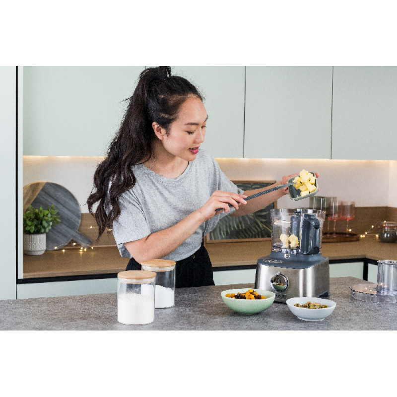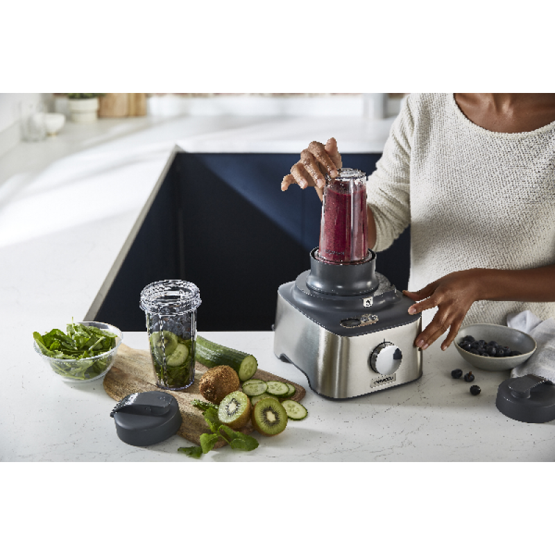 De vele bijgeleverde accessoires bieden alle voordelen van een grote food processor, maar dan in een compact formaat.