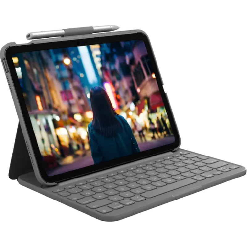 De LOGITECH Slim Folio Oxford toetsenbordcover in de kleur grijs beschermt je 10e generatie iPad als geen ander tegen krassen en stoten. Tegelijkertijd geniet je van een comfortabele schrijfbeleving. Het toetsenbord met gelijkmatig verspreide toetsen zorgt voor snel en nauwkeurig typen, terwijl de rij iOS-sneltoetsen eenvoudige toegang tot bediening van multimedia biedt.