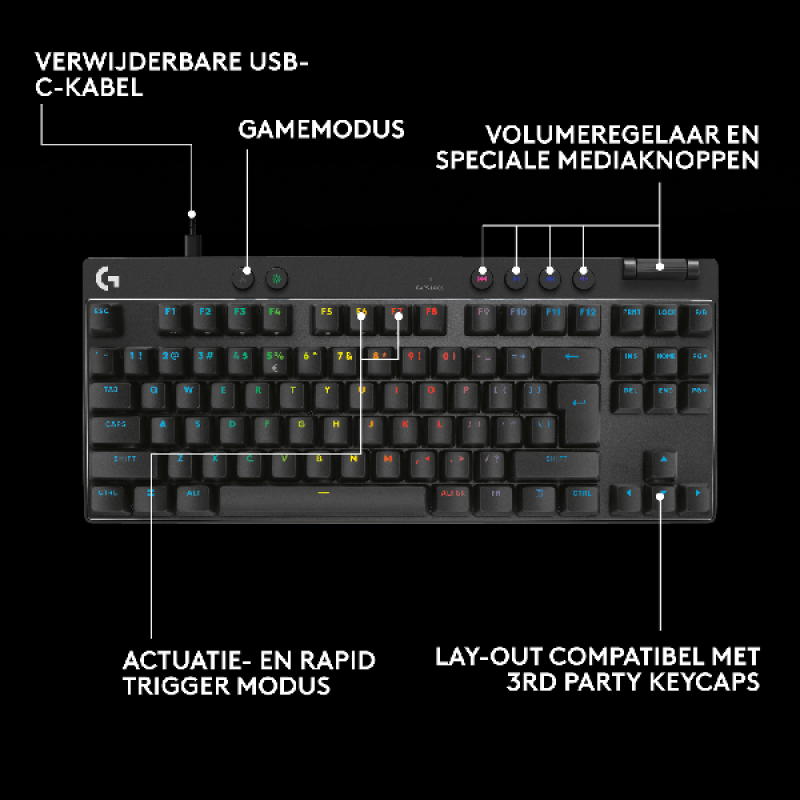 Het Logitech Pro X TKL bekabelde gaming-toetsenbord in zwarte uitvoering met uitstekende programmeerbare toetsen, sublieme RGB-verlichting en talrijke handige gebruiksvriendelijke functies zorgt voor een ongeëvenaarde game-ervaring. Met een standaard toetsenbordindeling en duurzame dubbellaagse PBT-toetsen game en typ je comfortabel gedurende lange sessies en ben je klaar om te winnen. Het toetsenbord is voorzien van een 1,8 m lange kabel die je verbindt aan een USB-C-poort.