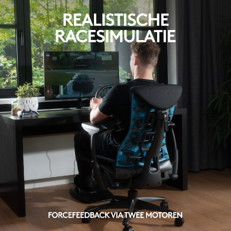 Tijdens het rijden voelen overstuur, onderstuur en driften aan alsof je in een echte racewagen zit. De twee motoren in het stuur met forcefeedback simuleren het bochtengevoel op elk type terrein. Daarnaast bieden de helische tandwielen een vloeiende en precieze stuuractie. Dankzij de anti-backlash spanning blijven het stuurwiel en de pedalen strak, voor een maximale beheersing. De afzonderlijke vloerpedaleneenheid beschikt over drie pedalen voor het schakelen, gas geven en remmen. Zo voelt het precies aan zoals in een echte auto!