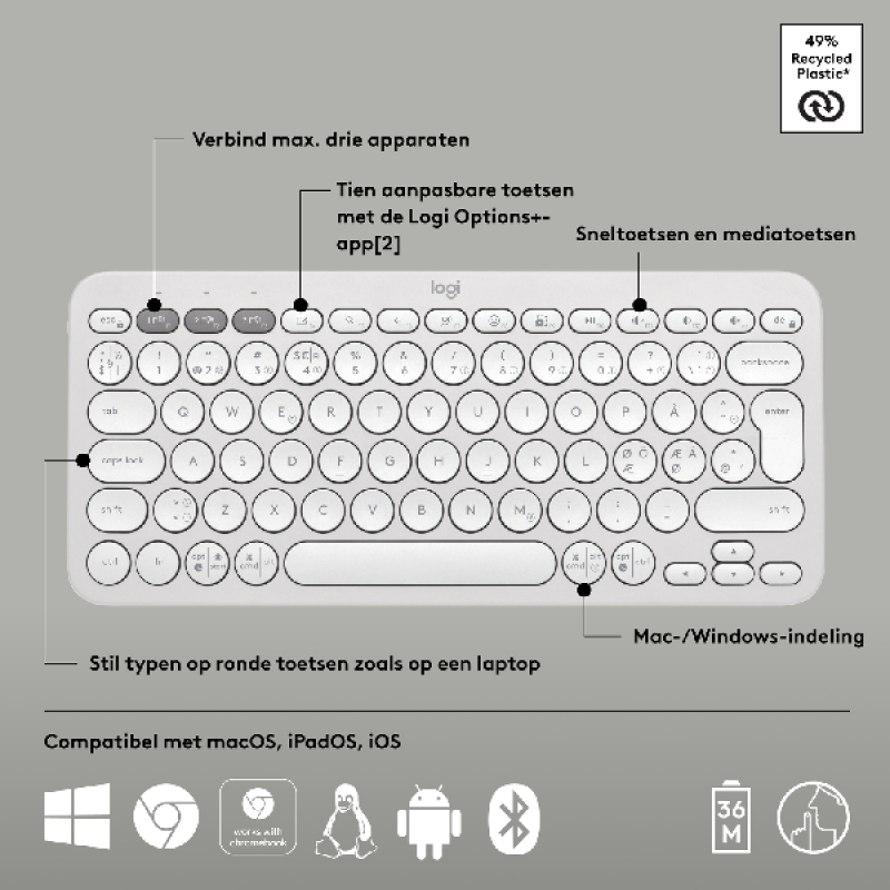LOGITECH Draadloos toetsenbord Pebble Keys 2 K380s AZERTY Wit (920-011804)