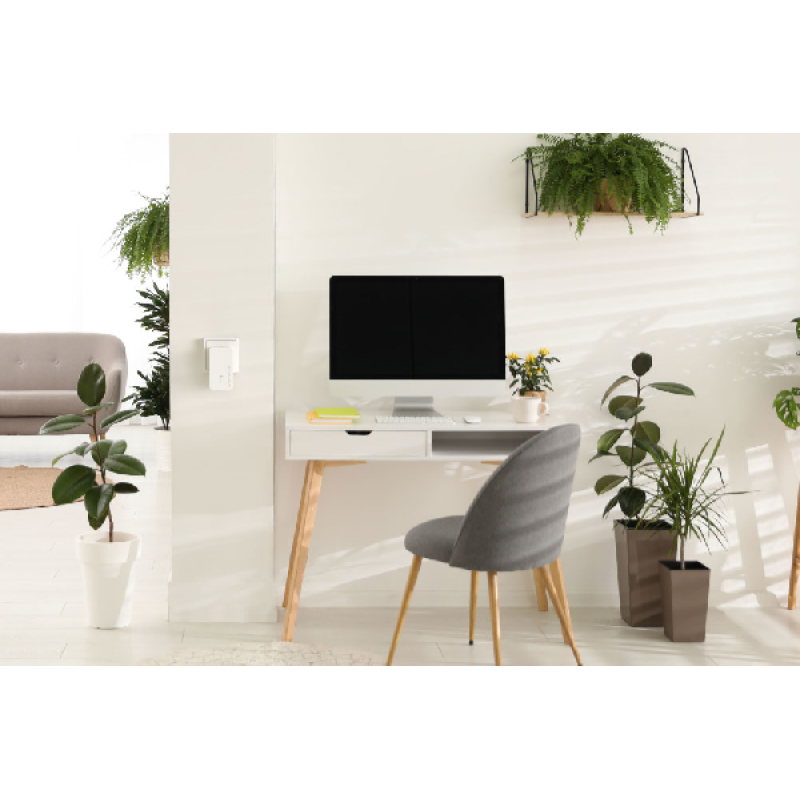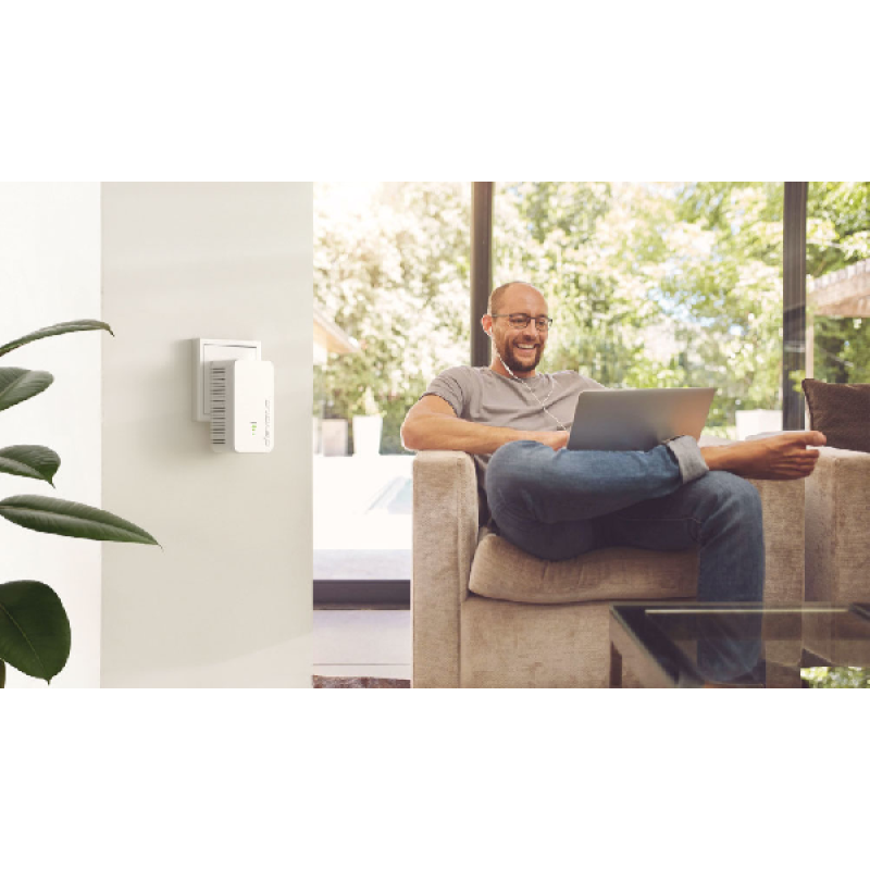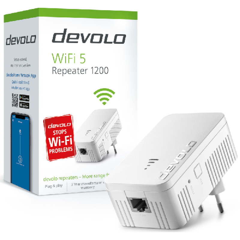 Thuis gewoon betere WiFi: de devolo WiFi 5 Repeater 1200 is perfect voor iedereen die zijn of haar WiFi snel wil uitbreiden. Ideaal voor internetten met uw smartphone, tablet of laptop en voor de ondersteuning van streamingplatformen, zoals Netfl ix. De WiFi 5-standaard voorziet in een verbinding met een snelheid van maximaal 1.200 Mbps. De signaalsterkte-indicator met vier niveaus toont de WiFi-performance van uw apparaat. Voor alle vaste apparaten, zoals smart-tv’s, mediaontvangers of gameconsoles, is ook een netwerkverbinding mogelijk. Uw devolo-repeater is met één druk op de WPS-knop eenvoudig te installeren. Of gebruik de devolo Home Network-app of een webinterface. devolo ontwikkelt netwerkproducten voor miljoenen klanten over de hele wereld en biedt drie jaar fabrieksgarantie!