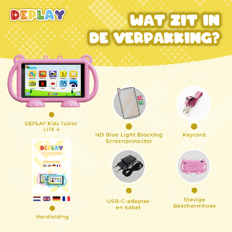 De Kids Lite 4 tablet heeft 4GB RAM-geheugen en 32GB opslagruimte en biedt volop kijk- en speelmogelijkheden voor de jongste leden van het gezin. Deplay heeft deze tablet namelijk uitgerust met verschillende vooraf geïnstalleerde applicaties en games voor kinderen die educatief en verantwoord zijn, zoals Disney+, Duo ABC, Zappelin of Squla. Je vindt er ook een veilige kindermodus en schermbeveiliging tegen blauw licht om de ogen van je lieve kind te beschermen. Om de nieuwsgierigheid van je kind te stimuleren heeft de tablet een 2 megapixel camera aan de voor- en achterkant, zodat ze foto's kunnen maken van de dingen om hen heen.