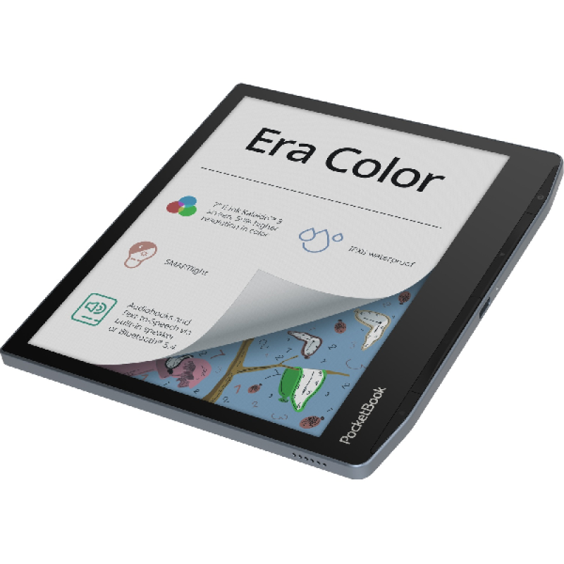 De Pocketbook Era Color Stormy Sea laat jou een nieuw tijdperk van digitaal lezen in kleur ontdekken. Deze elegante, compacte e-reader is voorzien van een vernieuwd oogveilig 7 inch (17,8 cm) E Ink Kaleido 3 kleurenscherm met een 50% hogere resolutie in kleur. Zijn IPX8-bescherming tegen water zorgt daarbij dat je ook aan het zwembad zorgeloos een spannend e-book leest. Daarnaast maakt de SMARTLIGHT-functie dat de kleurtint van het scherm zich slim aanpast. De e-reader ondersteunt 25 verschillende E-bookindelingen, waaronder stripboeken en manga en voorziet een tekst-naar-spraakfunctie om elk tekstbestand van jouw keuze hardop voor te lezen. Dankzij de Bluetooth 5.4-ondersteuning geniet je ook van je favoriete audioboek en via wifi en Cloud-services koop en beheer je al je e-books.