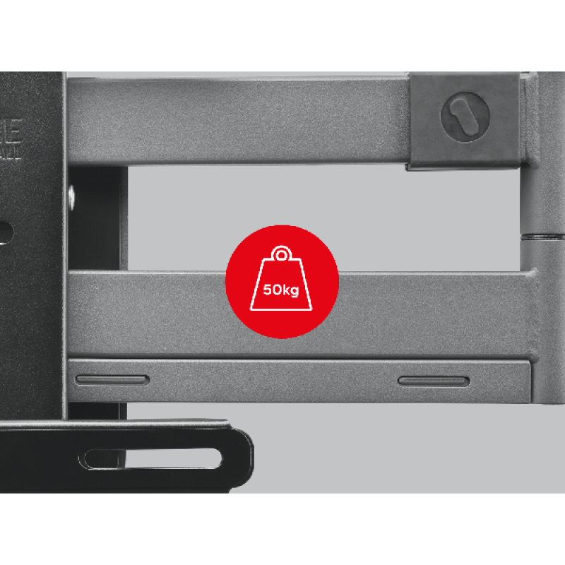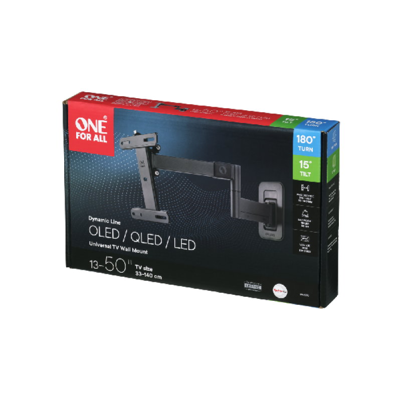 Met de One For All WM5250 hang je jouw tv in geen tijd aan een muur van jouw keuze. Deze handige muurbeugel is bovendien 180° draaibaar en 15° kantelbaar, zodat je hem makkelijk op hogere of lagere plaatsen monteert, bijvoorbeeld in een keuken, slaapkamer of fitnessruimte. Hij ondersteunt VESA-maten van 100 x 100 tot 200 x 200 mm, schermdiagonalen van 13 tot 50 inch en kan tot 50 kilo draaggewicht aan.
