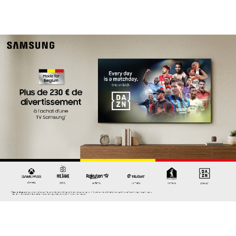 Ook dit jaar biedt Samsung het Made for Belgium pakket* aan. Bij aankoop van een Samsung TV ontvang je een entertainment-pakket ter waarde van meer dan €230. Zo zit je op het puntje van je stoel met die spannende sportwedstrijd van DAZN, geniet van je favoriete serie op TV Vlaanderen/Télésat, organiseer je een game-avond met je vrienden via de Cloud Gaming-app van Xbox Game Pass Ultimate of ga je sportief aan de slag met de Fit At Home-app! Alles is mogelijk dankzij het brede aanbod dat het Made for Belgium-pakket biedt. Zo geniet je van de optimale tv-ervaring!