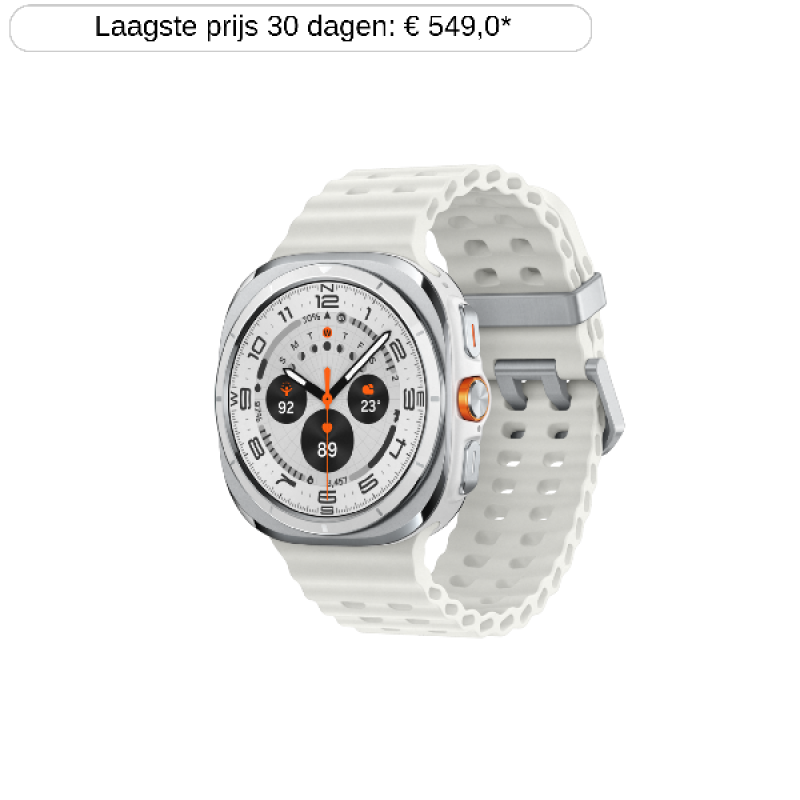 De Galaxy Watch Ultra 47mm LTE in Titanium White combineert een strak design met robuuste materialen. De titanium behuizing en het saffierglas zorgen voor een hoge duurzaamheid en weerstand tegen krassen. Met een kastgrootte van 47 mm en een gewicht van 60,5 gram biedt deze smartwatch een stevige, maar comfortabele pasvorm voor dagelijks gebruik. Het matte siliconen bandje is verwisselbaar, zodat je het horloge kunt aanpassen aan je persoonlijke stijl. Daarnaast is de smartwatch waterbestendig tot 10 ATM en heeft hij een IP68-classificatie, wat betekent dat hij bestand is tegen stof en water, ideaal voor diverse buitenactiviteiten.