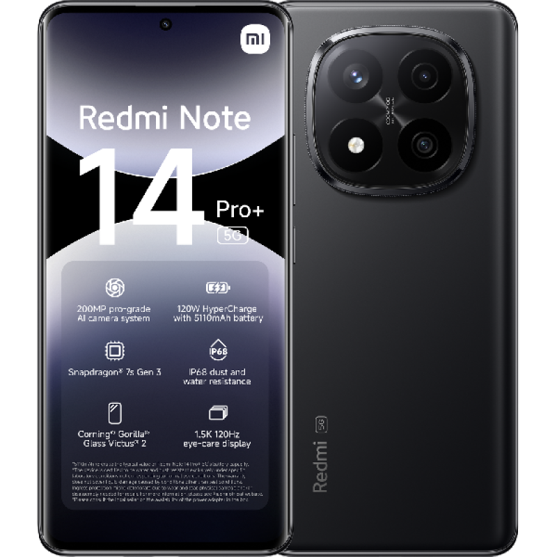 De Xiaomi Redmi Note 14 Pro+ in Midnight Black is een stijlvolle en krachtige smartphone, die je aandacht trekt met zijn elegante en opvallende premium look. Zo combineert deze smartphone een strak en stijlvol ontwerp met een indrukwekkend 6,67-inch 1,5k CrystalRes-display. Je kijkt naar vloeiende, scherpe beelden op een resolutie van 1.220 x 2.712 pixels en met een verversingssnelheid tot 120Hz. De Redmi Note 14 Pro+ is ook voorzien van een Corning Gorilla Glass Victus 2-scherm, wat zorgt voor extra duurzaamheid en bescherming tegen krassen en vallen. En met zijn IP68-certificering is hij zowel stof en waterbestendig.