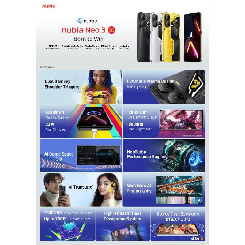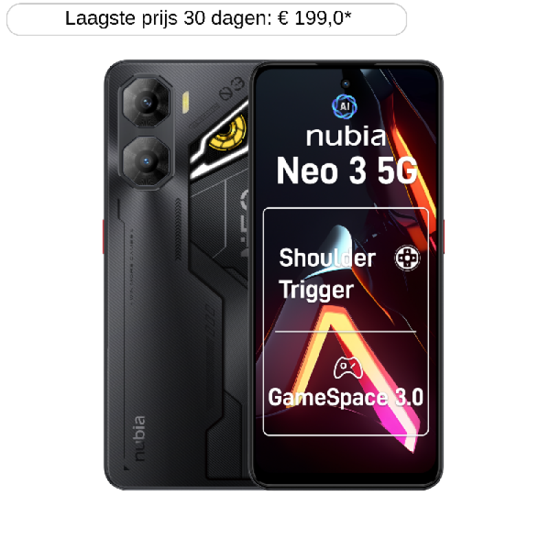 De ZTE Nubia Neo 3 5G is een stijlvolle en krachtige smartphone voor gamers. Het toestel beschikt over een amoled-scherm van 6,8 inch ( 17,2 cm) met een verversingssnelheid van 120 Hz, wat zorgt voor vloeiende beelden tijdens het gamen en browsen . Aangedreven door de Unisoc T8300-chipset en voorzien van 8 GB RAM en 128 GB opslagruimte, biedt de Neo 3 solide prestaties voor dagelijks gebruik en gaming. De dubbele achtercamera bestaat uit een hoofdlens van 50 MP en een dieptesensor van 2 MP, terwijl de 16 MP-frontcamera geschikt is voor selfies en videogesprekken. De 6.000 mAh-batterij ondersteunt snelladen en bypass charging, wat handig is tijdens langdurige gamesessies. Extra gamingfuncties zoals drukgevoelige zones en een RGB-licht aan de achterkant verbeteren tot slot je game-ervaring.