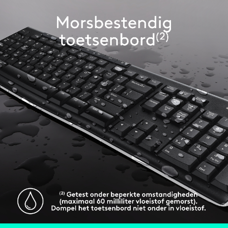 Met het zwarte Logitech MK270 draadloos toetsenbord + draadloze muis krijg je het gebruiksgemak van het toetsenbord en de nauwkeurigheid van de muis. De verbinding verloopt volledig draadloos, dankzij de usb-ontvanger waarmee je tot wel 10 meter bereik hebt. Het AZERTY-toetsenbord is morsbestendig, waardoor het geen ramp is als je er wat van je drankje op morst. Verder geven de 8 sneltoetsen je een snelle en directe toegang tot je e-mails en andere veelgebruikte programma’s. Je gebruikt de compacte muis, dankzij de nauwkeurige optische sensor, probleemloos op verschillende oppervlakken.