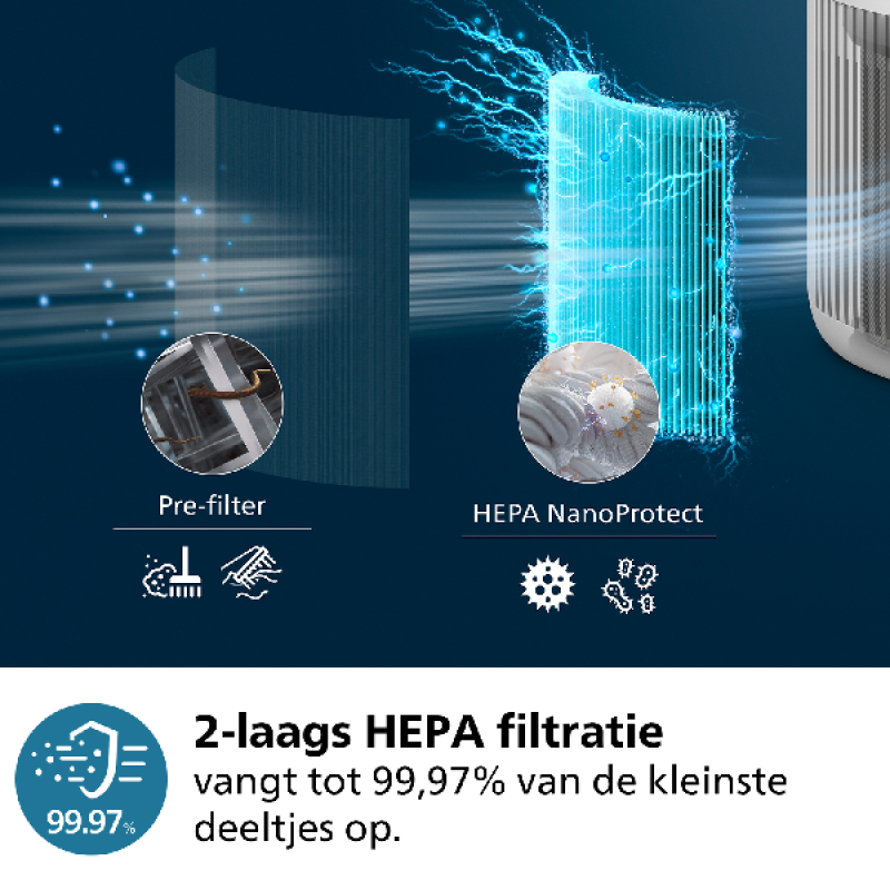 De PureProtect Mini beschikt over een 2-laagse filtersysteem met een voorfilter en een HEPA NanoProtect-filter. Deze vangt 99,97% van de deeltjes tot 0,003 micron op. En dat is kleiner dan zelfs het kleinste bekende virus. Maar ook stofmijten, pollen, huisdierallergenen of schimmelsporen zijn geen probleem voor deze luchtzuiveraar. Het filter vervangen is niet moeilijk en hoeft gelukkig niet vaak. Het originele Philips-filter blijft zelfs een jaar lang goed werken. Het apparaat geeft bovendien vanzelf een melding wanneer het tijd is om het filter te vervangen.