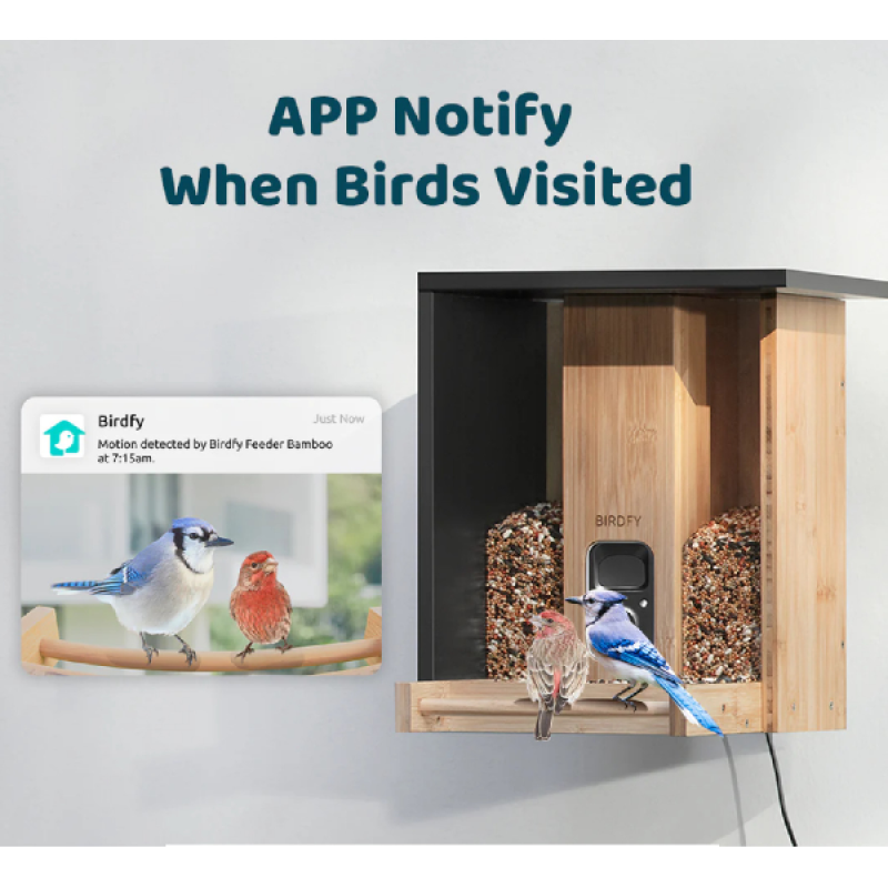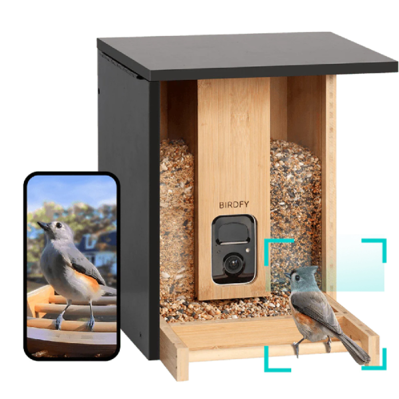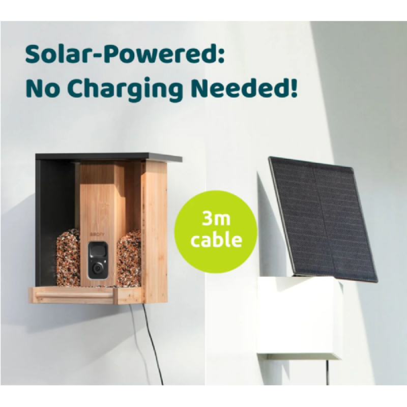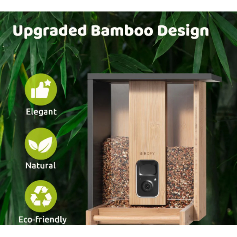 De Birdfy Bird watch camera met voeder en zonnepaneel in zwarte versie is vervaardigd uit milieuvriendelijk water- en schimmelresistent bamboe en brengt de vogels in je achtertuin of op je balkon haarscherp in beeld. Je vult de voederbak met tot 3 liter vogelzaad, zodat ze zich kunnen aansterken tijdens de winter. De krachtige batterij van 5000 mAh hoef je dankzij het meegeleverde zonnepaneel nauwelijks te herladen. Geniet van FHD-beeldkwaliteit en 24/7 notificaties bij gevleugeld bezoek, inclusief een abonnement voor 7 dagen AI-soortidentificatie.