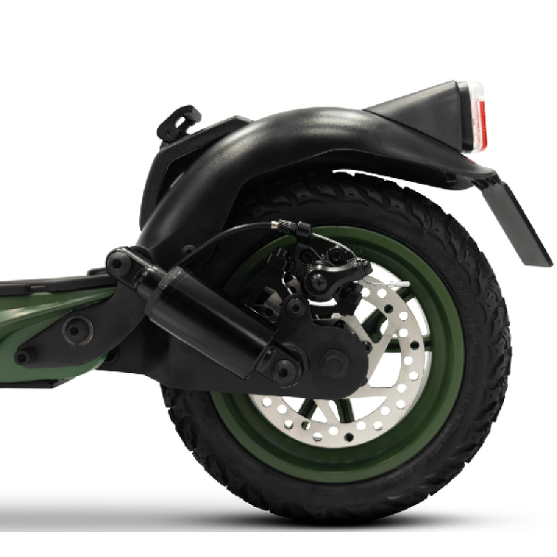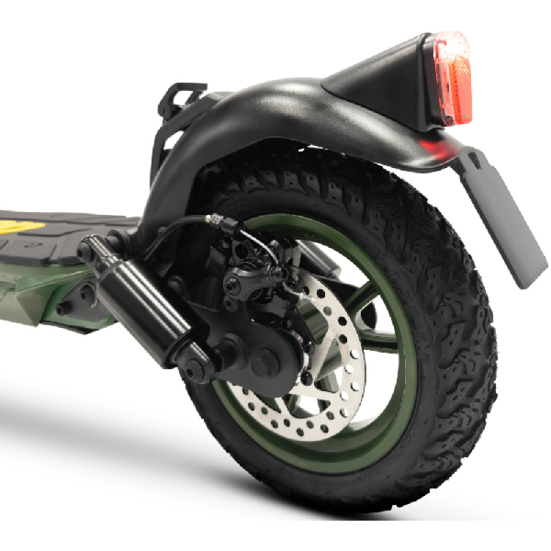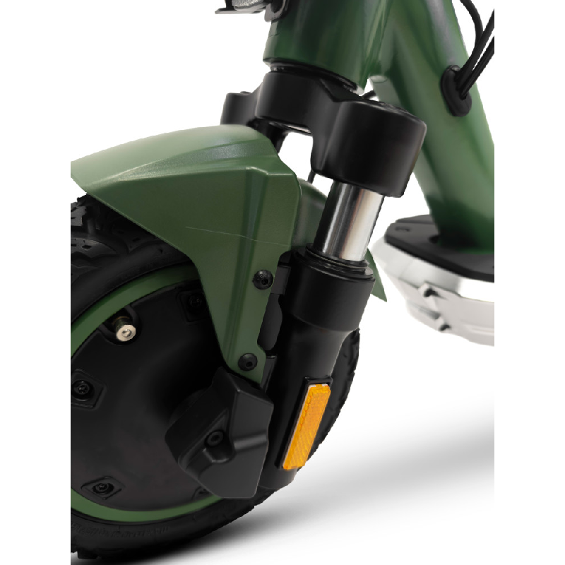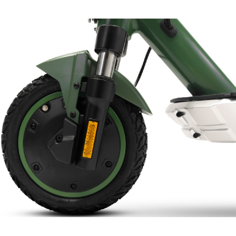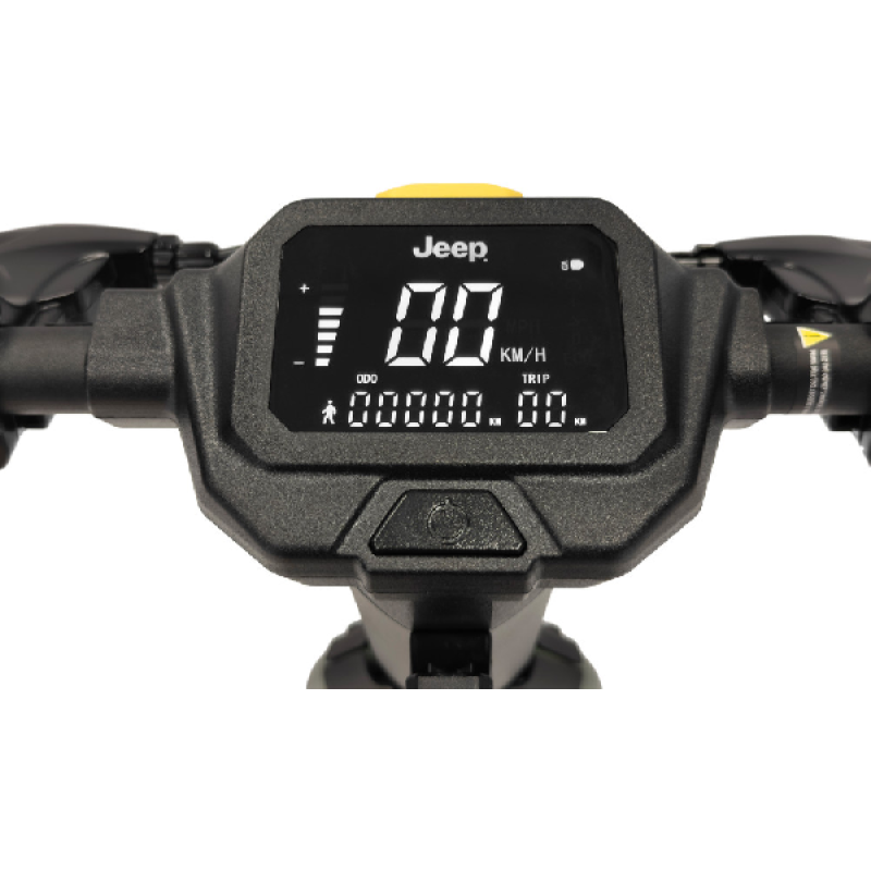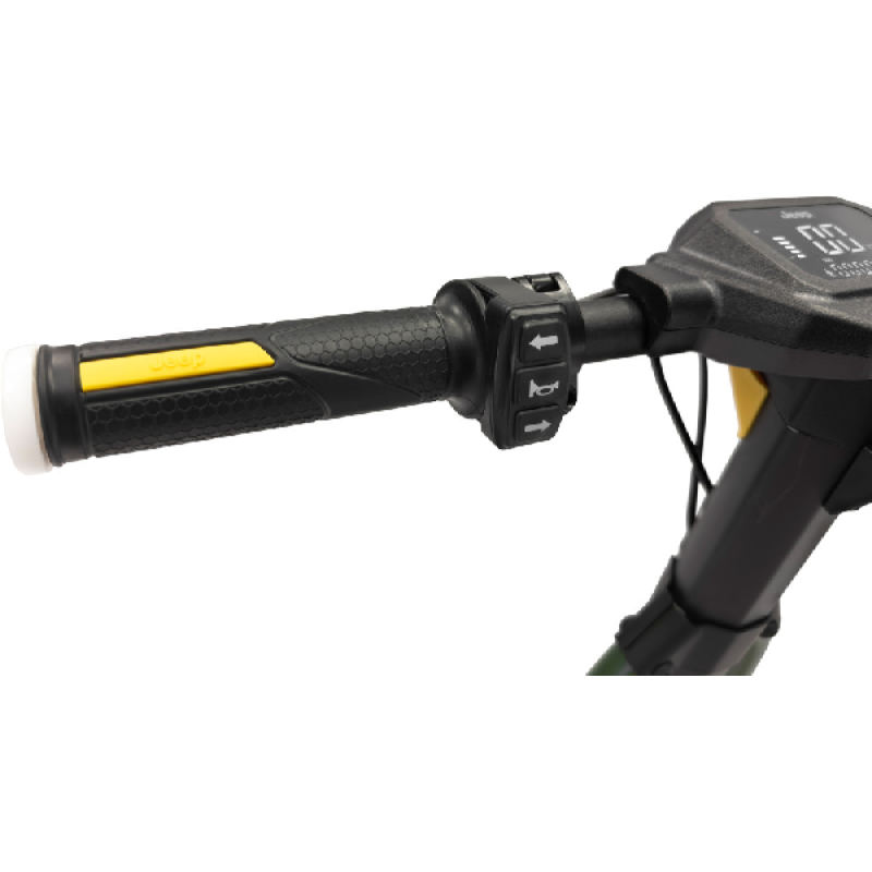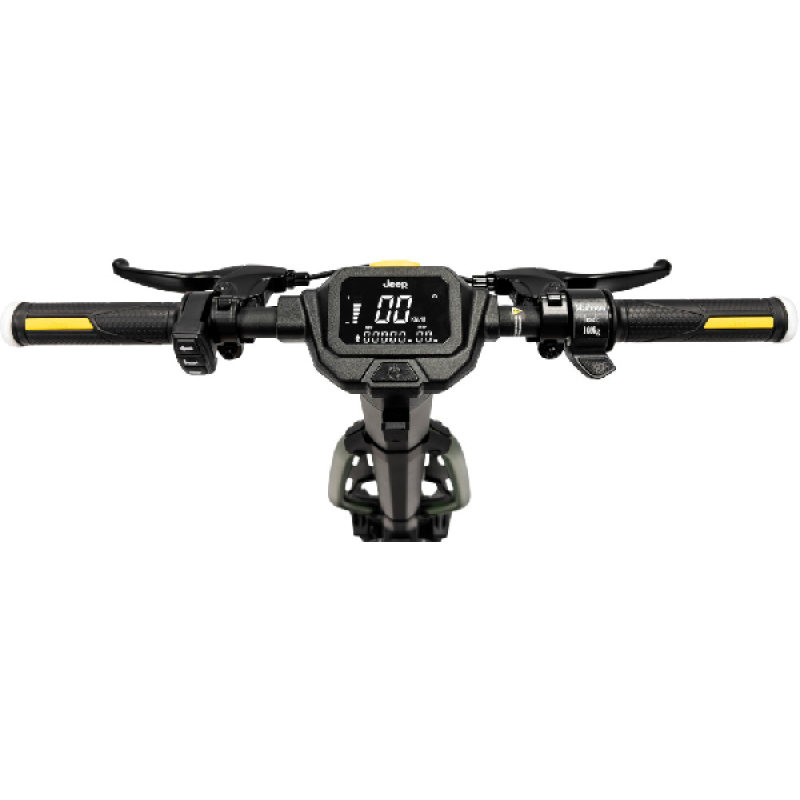 Met de groene Jad Advanced Safety elektrische step van Jeep haal je gemakkelijk een topsnelheid van 25 km/u. De combinatie van een krachtige 350 watt motor en een lange batterijduur bereik je vlot een afstand tot maar liefst 40 km. Deze opvouwbare e-step heeft een robuust en stoer ontwerp, het frame is ontworpen van magnesium en de step weegt 18,4 kilo. Hij is uitgerust met 10 inch (25,4 cm) banden die je een soepele rit geven zelfs op oneffen wegen. Dankzij hoogwaardige materialen en geavanceerde functies neemt deze elektrische step je mee op je volgende avontuur.