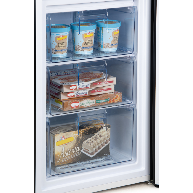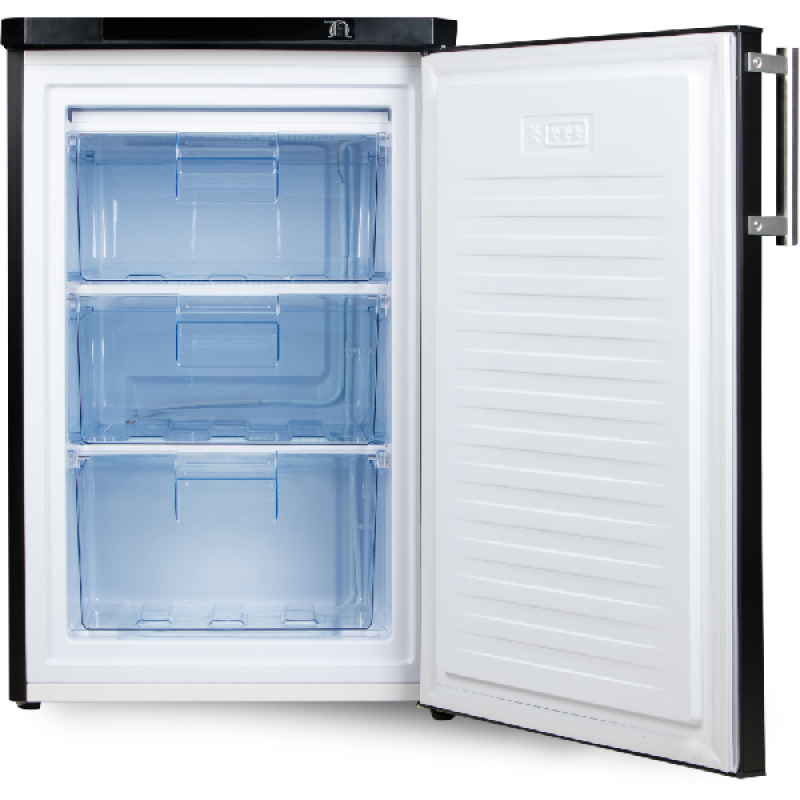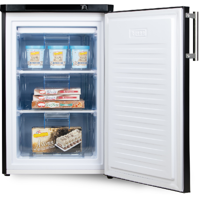 De vriezer biedt 80 liter opslagruimte en is voorzien van 3 praktische doorzichtige kunststof lades van verschillende afmetingen om je diepvriesproducten efficiënt op te bergen. Dankzij de transparante voorkant kun je gemakkelijk de inhoud van elke lade zien zonder ze telkens te moeten openen. De tweede XL-lade is ideaal voor pizzadozen, terwijl de bovenste lade ideaal is voor bijvoorbeeld ijsblokjesbakjes en kleine bakjes. Je kunt de temperatuur van de vriezer instellen met de kleine draaiknop aan de buitenkant van de deur.
