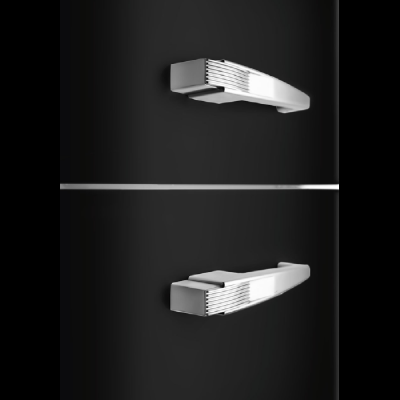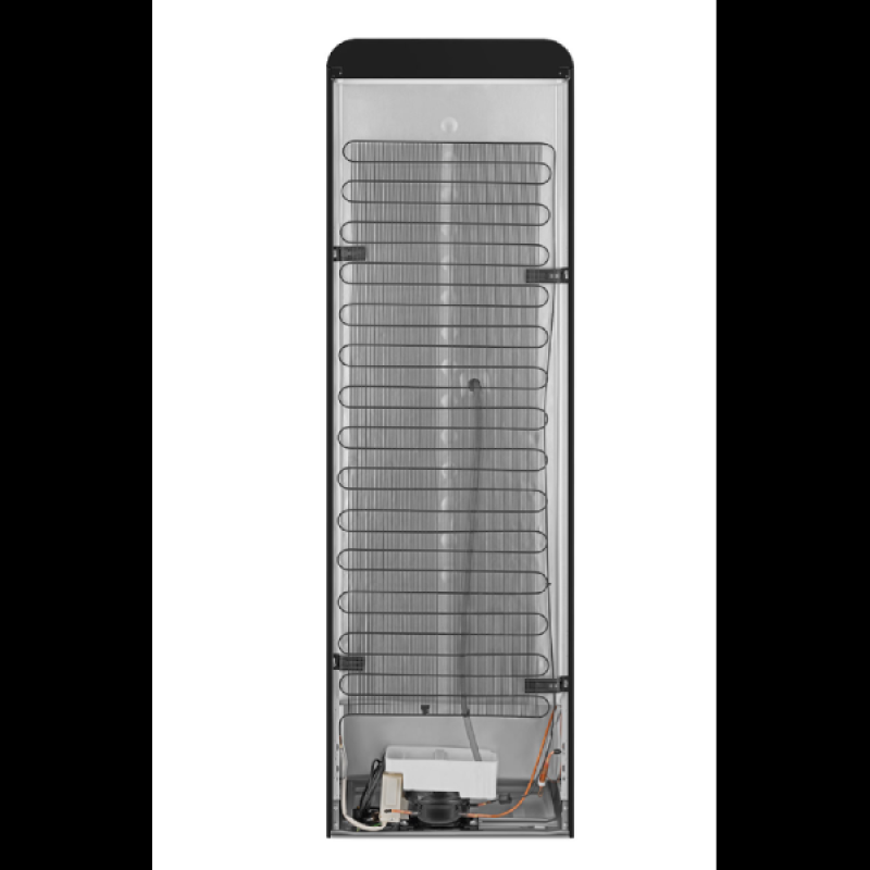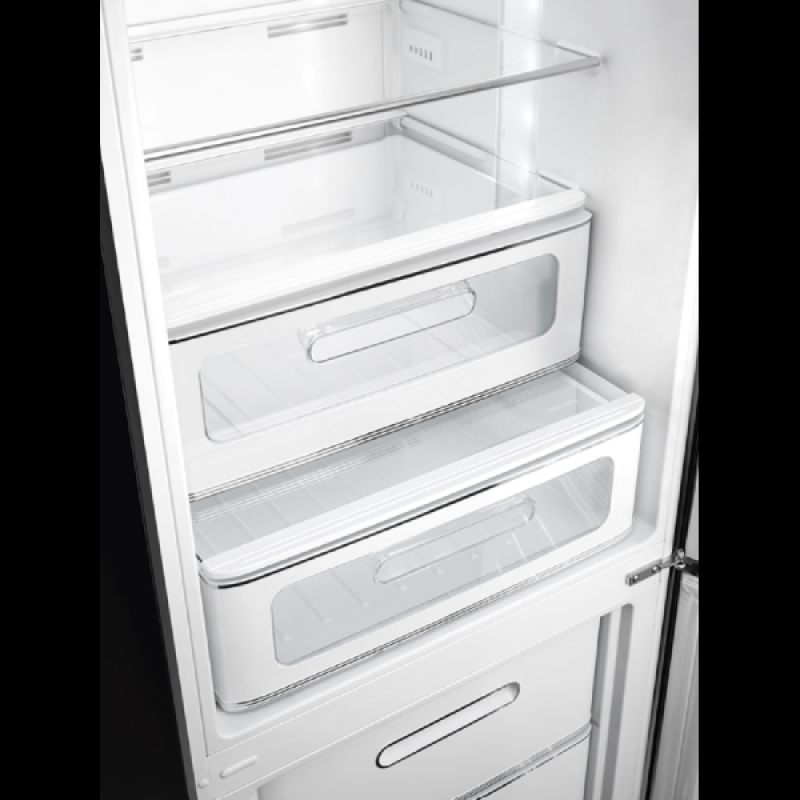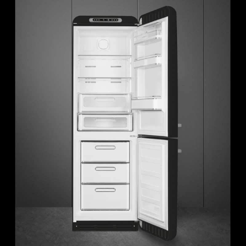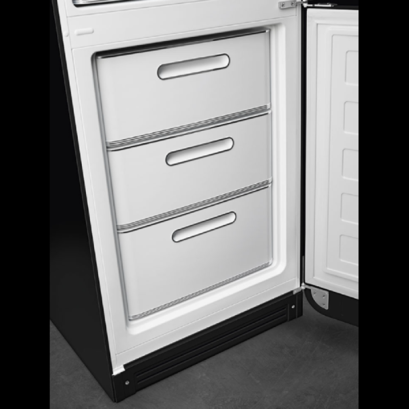 De zwarte Koelkast met diepvries 50's Style Collection van het bekende merk Smeg is bij uitstek geschikt voor nostalgische geesten. Deze vrijstaande combikoelkast geeft je keuken een vleugje jaren 50 sfeer mee, biedt 234 liter koelruimte en 97 liter vriescapactiteit. Maar laat je door het jaren 50 uiterlijk niet in de maling nemen, het is een hypermodern apparaat! Het koelsysteem is statisch, het apparaat heeft 2 losse deuren met karakteristieke zilverkleurige handgrepen en de scharnieren zijn rechts gemonteerd. Onderin vind je de vriezer met 3 grote lades en in het koelgedeelte daarboven 2 grote lades en 2 legplanken, voor een totaal van 5 koelcompartimenten. De koelkastdeur op zijn beurt heeft 3 vakken waarvan de bovenste met een plastic deksel is uitgerust. Met een jaarlijks verbruik van 204 kWh mag je deze combi-koelkast gerust zuinig noemen en met een geluidsniveau van 37 dBa is hij ook nog eens nauwelijks hoorbaar. Kortom, een esthetische en praktische aanwinst voor elke keuken.