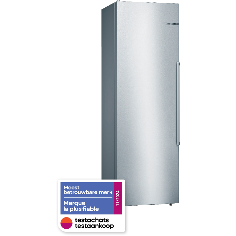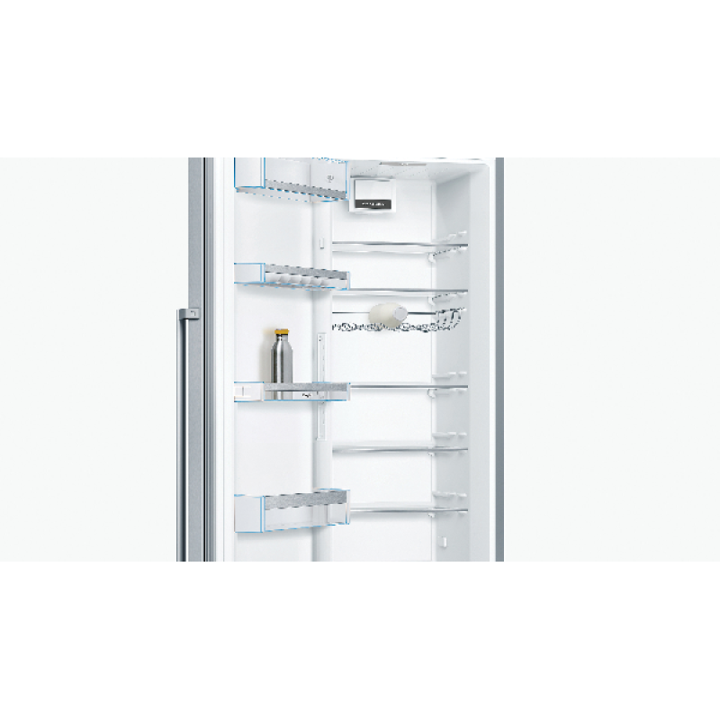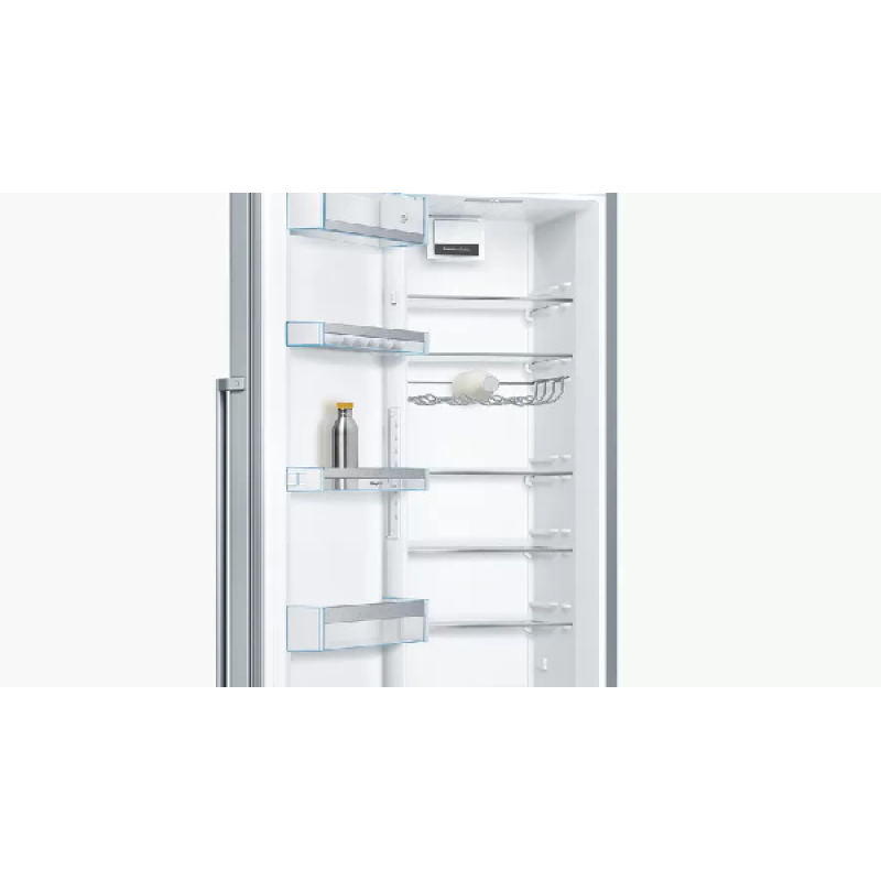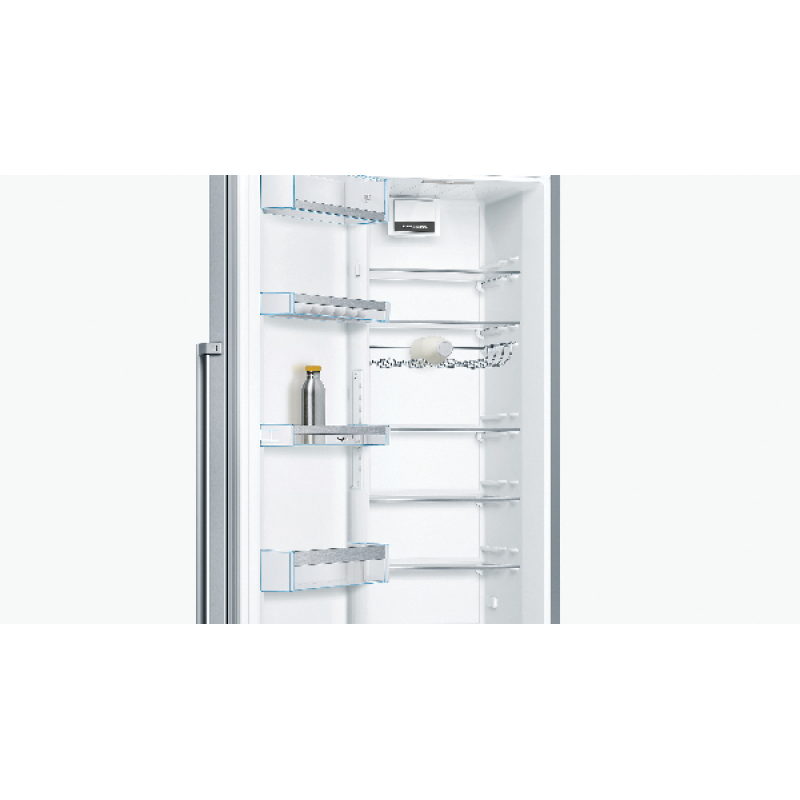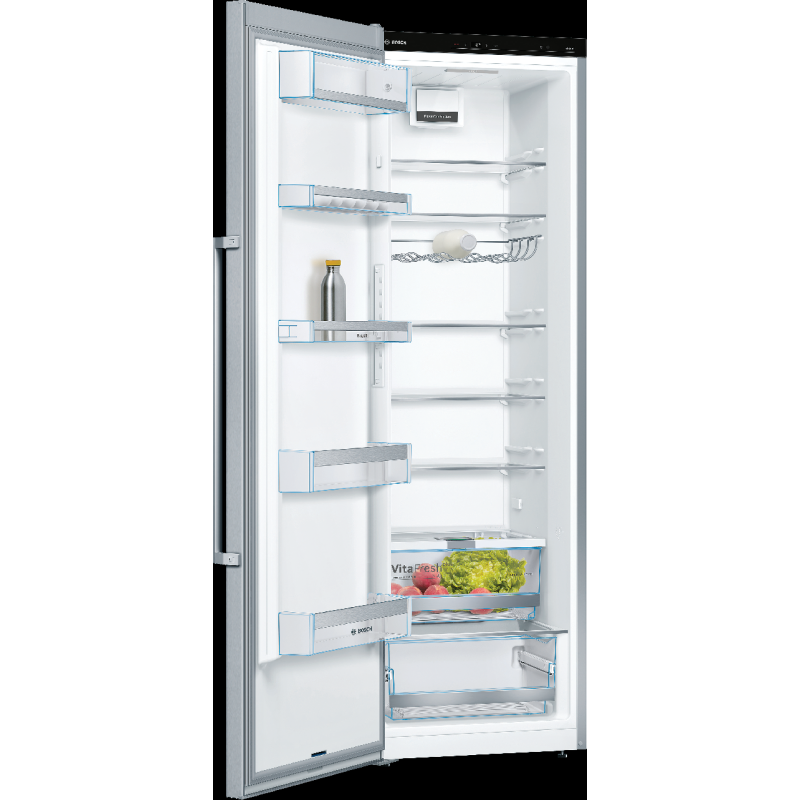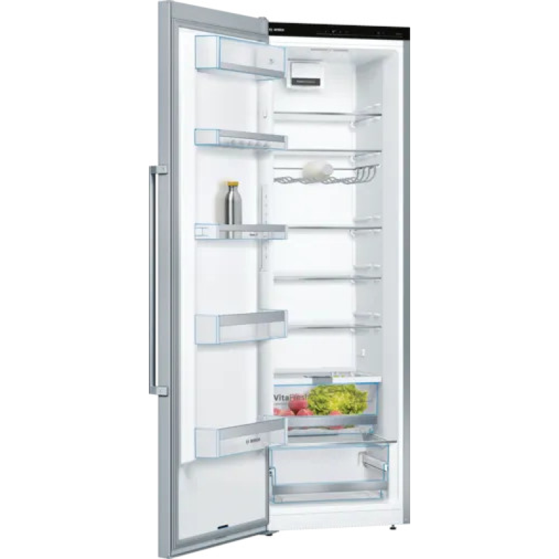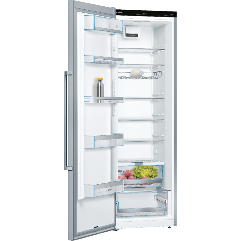 De Bosch KSV36AIDP koelkast kastmodel De Bosch met zijn roestvrijstalen afwerking voegt een vleugje elegantie toe aan je keuken. Hij is eenvoudig vrijstaande te installeren en dankzij de omkeerbare deur past hij zich aan jouw ruimte aan. Hij heeft een totale inhoud van 346 liter en beschikt over 7 legplanken, 5 deurvakken en een MultiBox-koellade om jouw fruit, groenten, vlees en vis langer vers te houden. Zoek je meer flexibiliteit? Deze koelkast is uitgerust met EasyAccess-legplanken. 5 van de 7 glazen legplanken zijn uitneembaar en 4 zijn in hoogte verstelbaar. De deurvakken zijn ook in hoogte verstelbaar, zodat je jouw koelkast naar wens kunt indelen. FreshSense-technologie zorgt voor een constante temperatuur en snelle koeling, waardoor reeds gekoelde producten vers blijven. De Bosch koelkast is bovendien uitgerust met ledverlichting voor optimaal zicht op de inhoud.