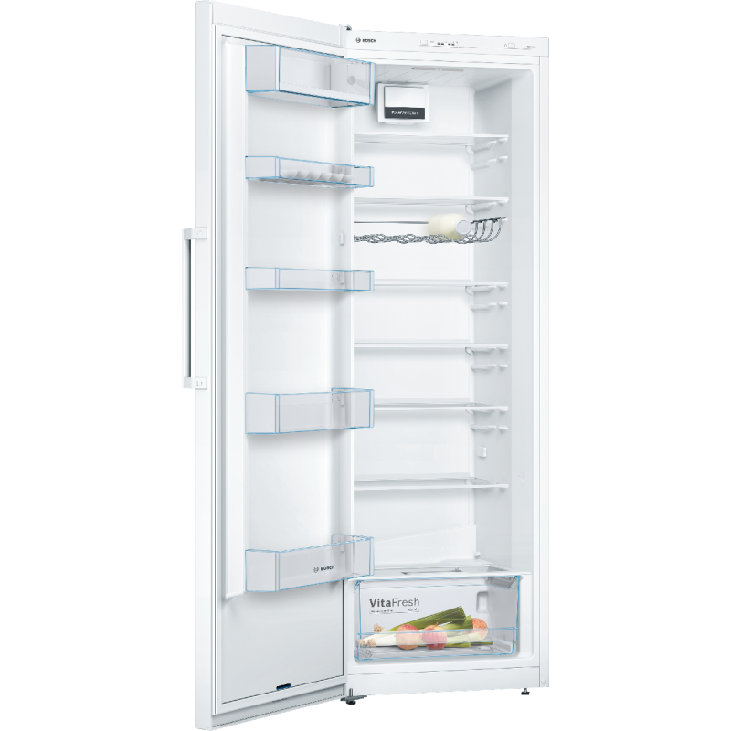 De witte Bosch KSV33VWEP kastkoelkast heeft een grote opbergruimte verdeeld over lades en legplanken. Hij is ideaal voor grote gezinnen die een grote hoeveelheid voedsel koel moeten houden om alle kleine monden te voeden.