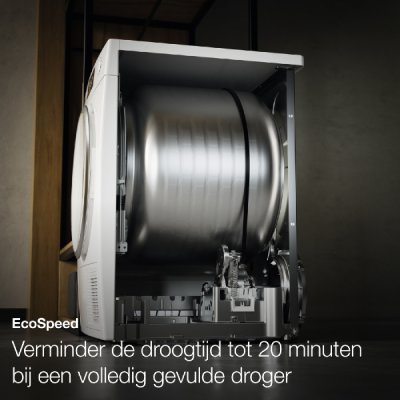(+) Sneller klaar met drogen: dankzij de EcoSpeed-technologie verkort je de droogtijd per cyclus met ongeveer 20 minuten.