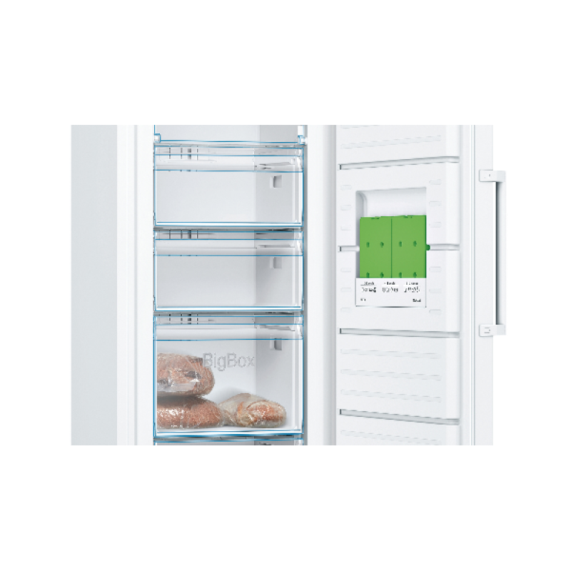 Deze Bosch diepvriezer is uitgerust met het FreshSense-systeem. Intelligente sensoren meten de temperatuur binnen en buiten de vriezer en reageren alert op temperatuurveranderingen. Dit zorgt ervoor dat uw diepvriesproducten in optimale omstandigheden bewaard blijven. Dankzij de Super Vriezen-functie kun je kleinere hoeveelheden sneller invriezen zonder de al ingevroren inhoud te ontdooien. Deze functie wordt automatisch geactiveerd zodat de temperatuur snel naar het oorspronkelijk ingestelde niveau terugschakelt. Bovendien gaat er een alarmsignaal af wanneer de deur niet goed gesloten is.