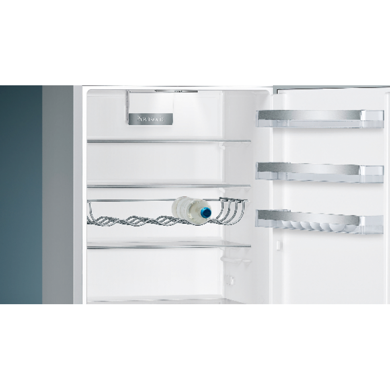 De in de zijwanden en het plafond verzonken led-lampjes zorgen voor een optimale en gelijkmatige verlichting van het interieur zonder te verblinden. Bovendien is dit model voorzien van een vingerafdrukbestendige coating, zodat je niet voortdurend de deuren hoeft schoon te maken. Zo blijft de koel-vriescombinatie er onberispelijk uitzien, zonder ongewenste afdrukken en vegen. Bovendien is het apparaat uitgerust met een praktisch horizontaal flessenrek dat het eenvoudig maakt om meerdere flessen op te bergen.