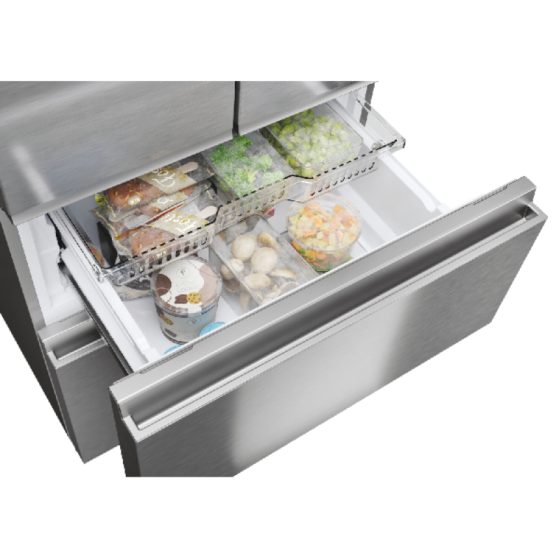 Met zijn roestvrijstalen afwerking en afmetingen van 70 x 177,5 x 68,8 cm past deze elegante koel-vriescombinatie in elke moderne keuken. Je doet de Franse deuren en lades open met de discrete handgrepen die geïntegreerd zijn in de staanders. Ze zijn bekleed met materialen die aangenaam aanvoelen en een uitstekende grip garanderen. Heb je honger of dorst midden in de nacht? Geen probleem. De koelkast is binnenin verlicht met ledverlichting, zodat je de inhoud van het compartiment duidelijk kunt zien, ook als het donker is. Tot slot houdt de koelkast je voedsel 12 uur lang koud in geval van een onvoorziene stroomonderbreking.