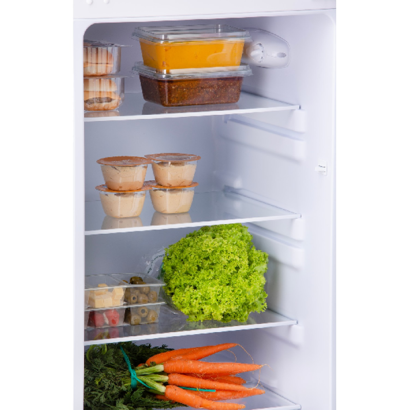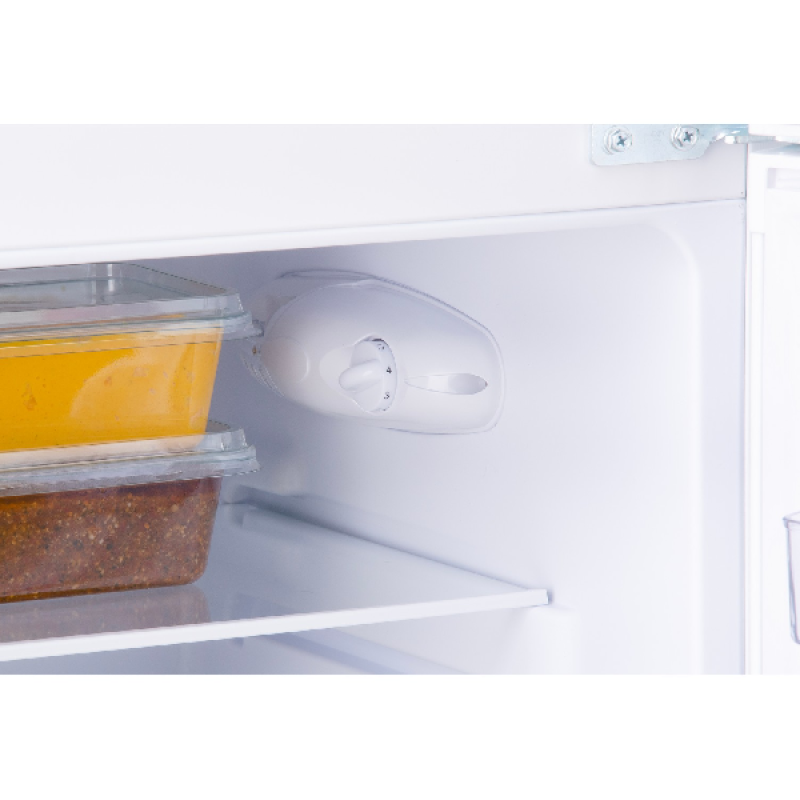 Deze koel-vriescombinatie biedt een totaalvolume van 206 liter waarvan 162 voor de koelkast en 44 voor de vriezer. Het koelkastcompartiment heeft 4 glazen legplateaus en een vershoudlade onderaan, plus 3 bakken in de deur voor flessen, blikjes en potten. Het vriesgedeelte wordt in tweeën gedeeld door een glazen legplateau. De temperatuur van de combi pas je eenvoudig aan met de draaiknop aan de binnenkant van de koelkast.