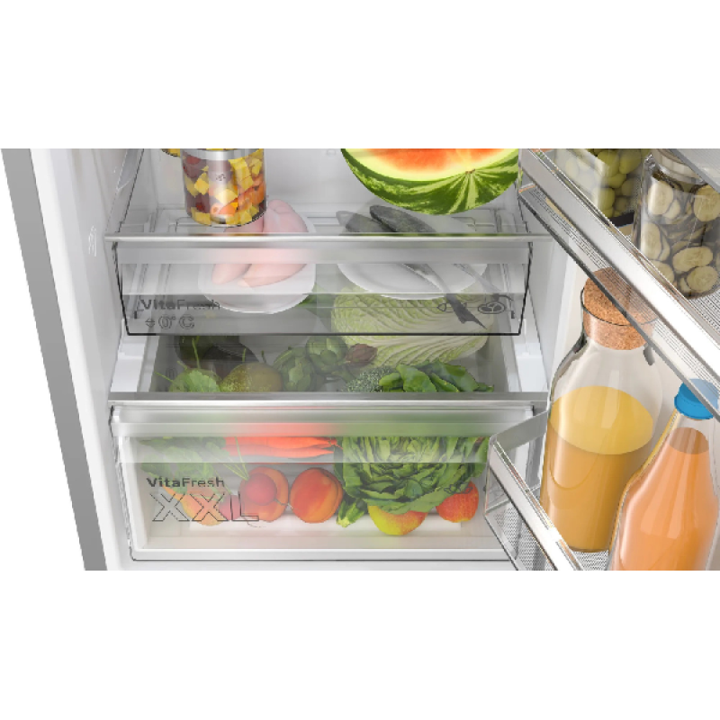 De koelkast, in het bovenste gedeelte, is uitgerust met 4 stevige glazen schappen - waarvan er 2 in hoogte verstelbaar zijn - en 2 vershoudladen, waaronder een Vita Fresh XXL om je voedsel langer vers te houden. In de deur bevinden zich 3 praktische opbergbakken voor flessen, blikjes, kleine potjes en eieren. De vriezer bevindt zich in het onderste gedeelte en heeft 3 transparante kunststof lades voor het optimaal bewaren van diepvriesproducten. Indien een technisch probleem zich voortdoet, of wanneer de deur niet meer goed sluit of te lang open blijft staan dan zal een geluidsignaal je hiervan waarschuwen.