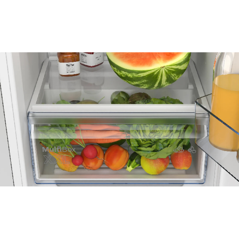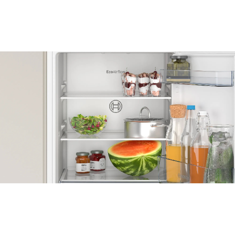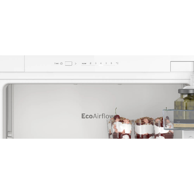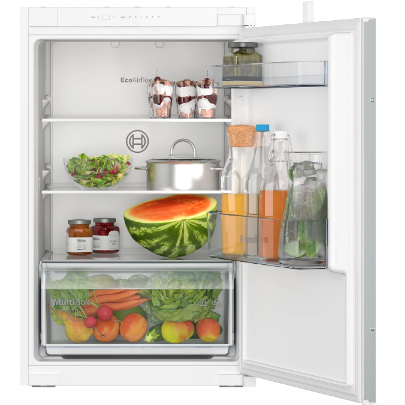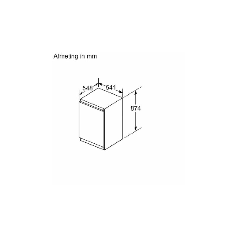 Deze inbouw koelkast E van Bosch is superhandig voor in je keuken of als extra koelkast in een ander vertrek. Zijn formaat is met 54,1 x 87,4 x 54,8 cm compact. Binnenin vind je 2 deurvakken en 2 in hoogte verstelbare plateaus. Hij beschikt verder over een extra grote la de voor groenten en de Eco Airflow-functie zorgt voor optimale ventilatie en daarmee een constante temperatuur en luchtvochtigheid. Doordat er geen wisselende temperaturen zijn, blijven je producten langer goed en bespaar je energie en geld. De ledlampen bevinden zich aan de voorzijde van het plafond en in de zijwanden. Ook deze lampen helpen je besparen want ze gebruiken bijzonder weinig elektriciteit, worden nauwelijks warm en gaan ook nog eens lang mee. Wanneer je nieuwe producten in de koelkast plaatst , koelen deze dankzij de Super Koelen functie efficiënt en snel af.