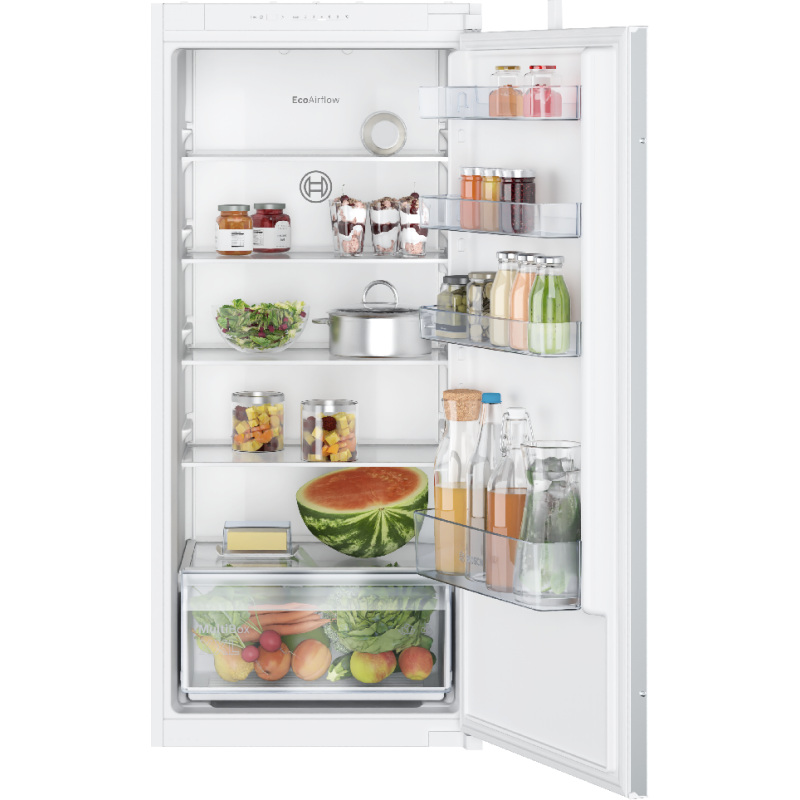 Met een inhoud van 204 liter biedt deze inbouwkoelkast van Bosch een royaal en slim ingedeeld opslagruimte. Hij beschikt over 5 veiligheidsglasplanken, waarvan er 4 in hoogte verstelbaar zijn, zodat je het interieur eenvoudig kunt aanpassen aan je gewoonten en de grootte van je producten. De XXL MultiBox-lade is speciaal ontworpen voor het bewaren van fruit en groenten onder optimale omstandigheden. De deurvakken maken het geheel compleet en bieden ruimte voor flessen, sauzen en kleine producten, waardoor de hoofdplanken vrij blijven.