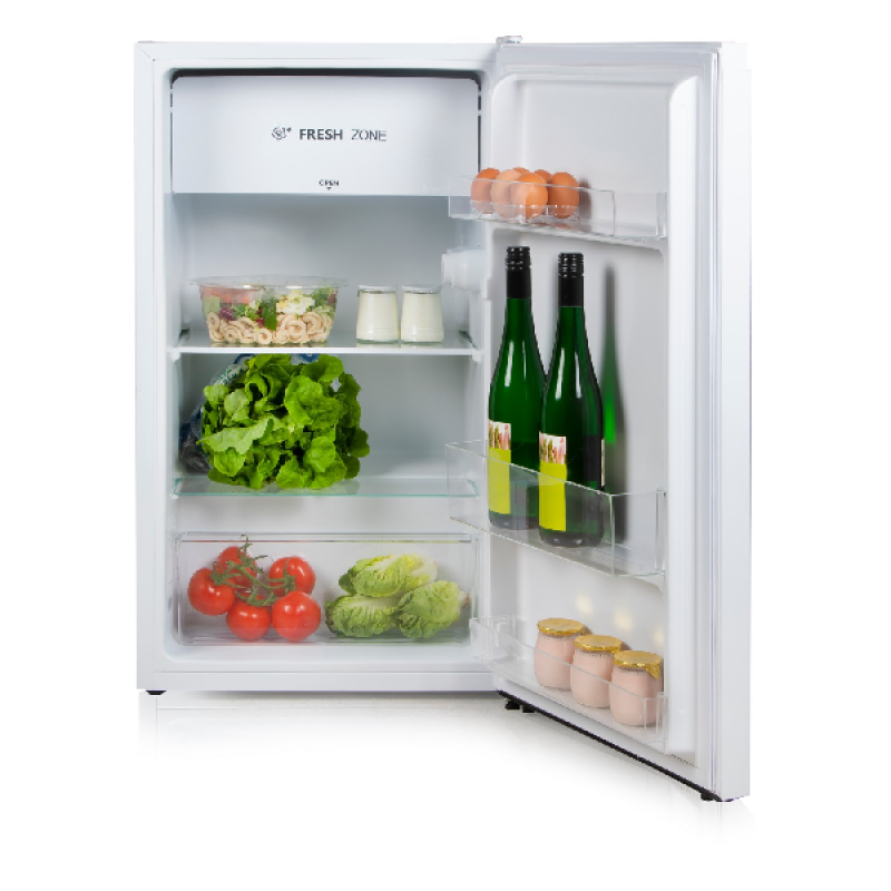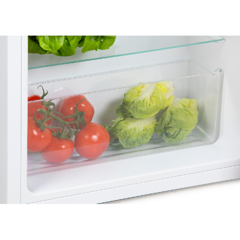 Deze koelkast heeft een inhoud van 94 liter, verdeeld over 2 legplanken, een vershoudlade onderaan en een vriesvak bovenaan. Er zijn 3 bakken in de deur voor het opbergen van flessen en blikjes. De stevige glazen schappen zijn eenvoudig te verwijderen om ze schoon te maken wanneer nodig. De onderste lade houdt fruit en groenten langer vers, terwijl je ijsblokjes en ijsjes in de vriezer kan bewaren. De temperatuur stel je eenvoudig in met de draaiknop aan de binnenkant.