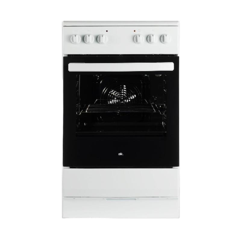 Dit OK elektrisch fornuis A in witte uitvoering biedt je met zijn 4 kookplaten en oven alles wat je nodig hebt om je kookkunsten voluit tentoon te stellen. De keramische kookvelden van verschillende groottes regel je met de handige draaiknoppen, en garanderen een gelijkmatige temperatuur. Daarnaast is dit fornuis van een multifunctionele oven van 62 liter voorzien; naast de traditionele boven- en onderwarmte beschik je over een krachtige gril en een voorverwarmingsfunctie. Na gebruik hoef je niet te schrobben, zowel het geëmailleerde kookveld als de binnenwanden van de oven maak je makkelijk schoon.